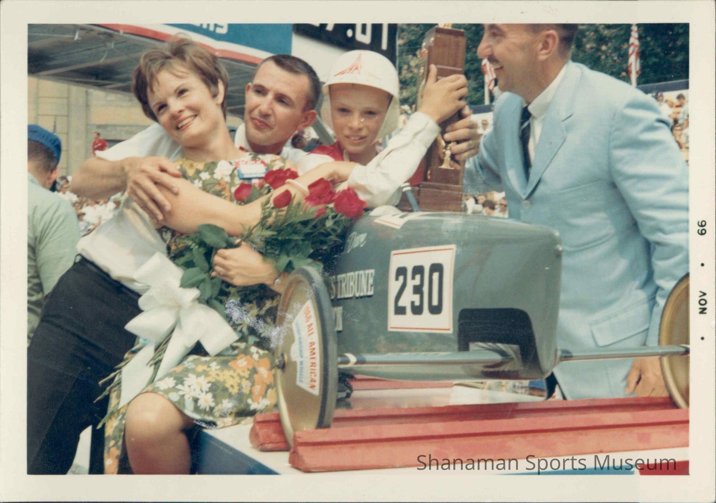 After winning the 1966 National Soap Box Derby championship, David Krussow celebrates with his mom and dad as David is presented with the winning trophy. After winning the race, Krussow's accomplishment was noted in Sports Illustrated's Faces In The Crowd. Krussow received a $7,500 college scholarship for winning. David and his dad worked on making their Soap Box Derby car, which had no motor and was driven by gravity. The fastest car to race at the Soap Box Derby nationals was clocked at 53 mph in 1977. Today, with a shorter hill, derby cars reach nearly 30 mph.Lexicon