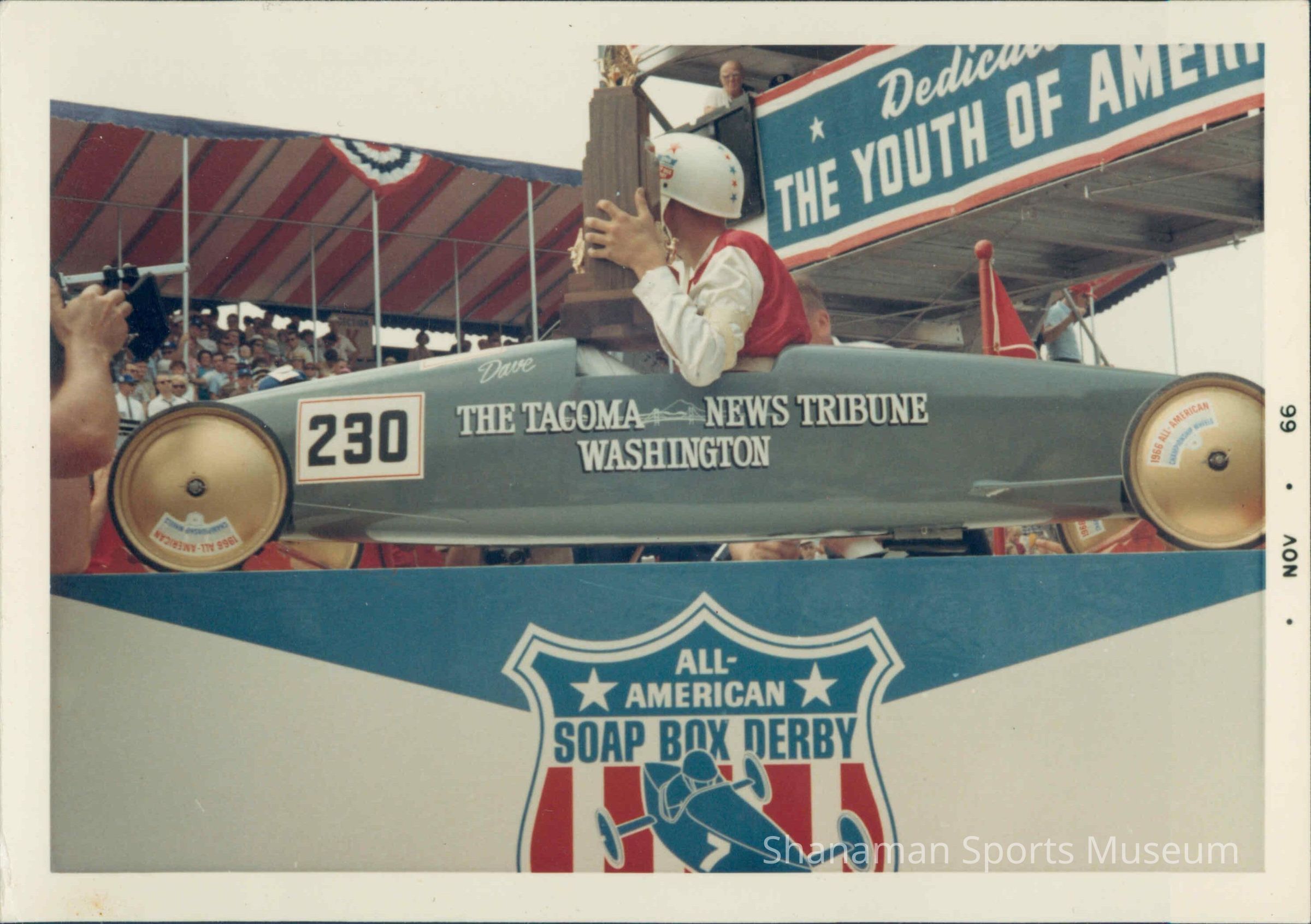 A 12-year-old David Krussow kneels by his soap box derby race car wearing a T-Shirt he got after winning the National Soap Box Derby race in Akron, Ohio, in 1966. On his homemade car, Krussow's dad included his son's name and the Tacoma News Tribune. The prototype for the stock derby car was built by Kenny Cline, who won the 1967 national race. He spent 1,400 hours building his childhood car, but the kit car he designed could be assembled in four hours. A derby car costs between $450 and $600 in 2015, depending on the division. Wheels cost another $120.Lexicon