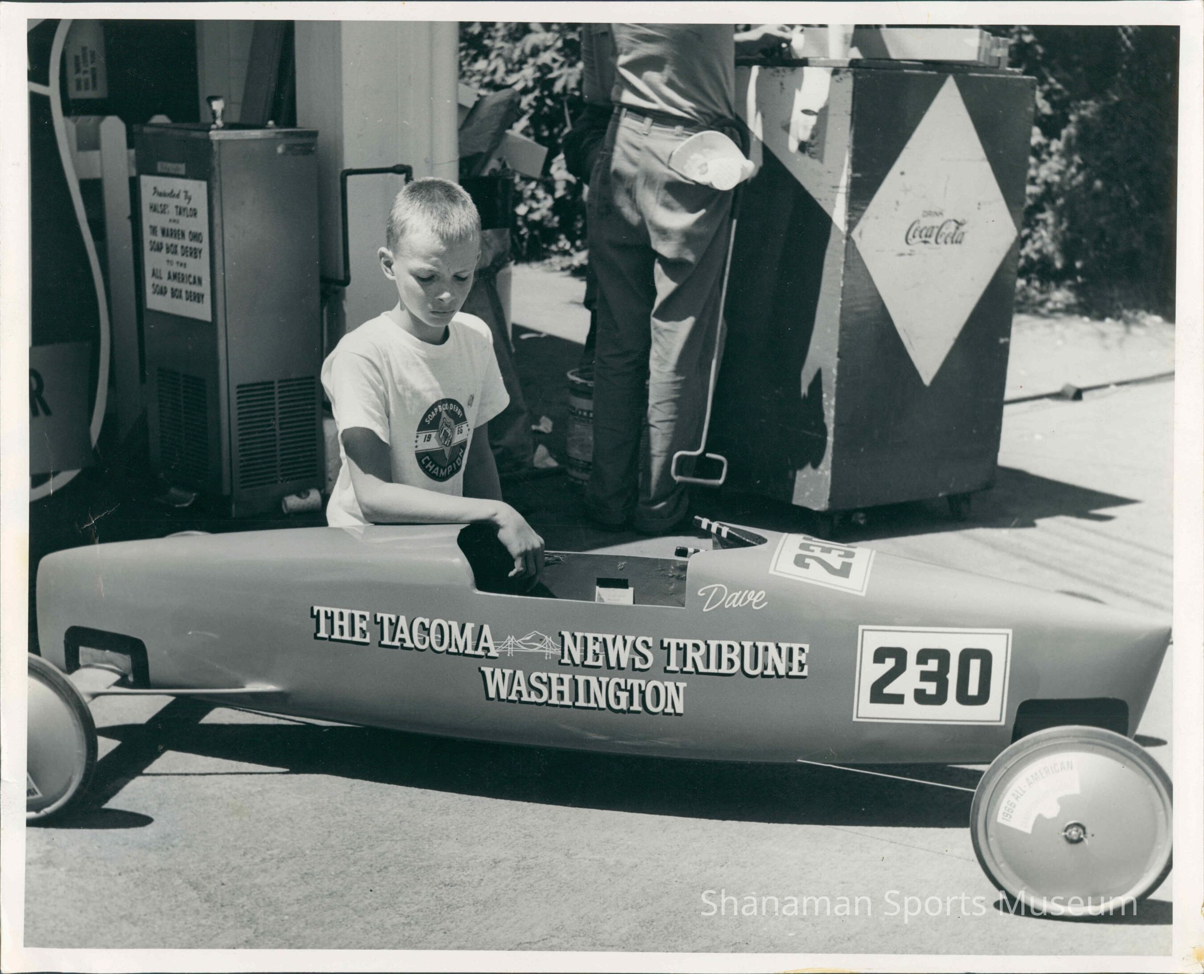 A 12-year-old David Krussow kneels by his soap box derby race car wearing a T-Shirt he got after winning the National Soap Box Derby race in Akron, Ohio, in 1966. On his homemade car, Krussow's dad included his son's name and the Tacoma News Tribune. The prototype for the stock derby car was built by Kenny Cline, who won the 1967 national race. He spent 1,400 hours building his childhood car, but the kit car he designed could be assembled in four hours. A derby car costs between $450 and $600 in 2015, depending on the division. Wheels cost another $120.Lexicon