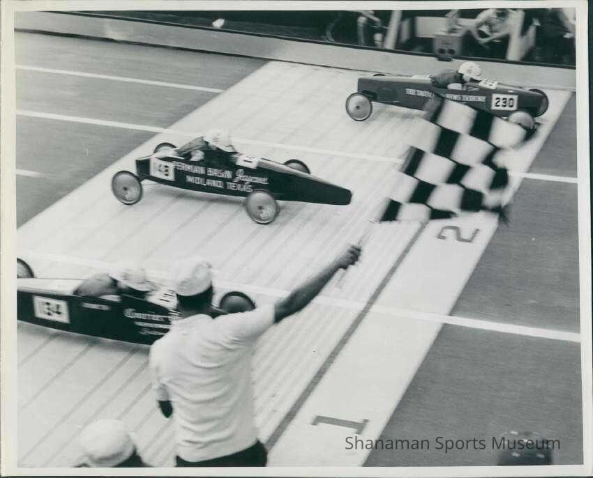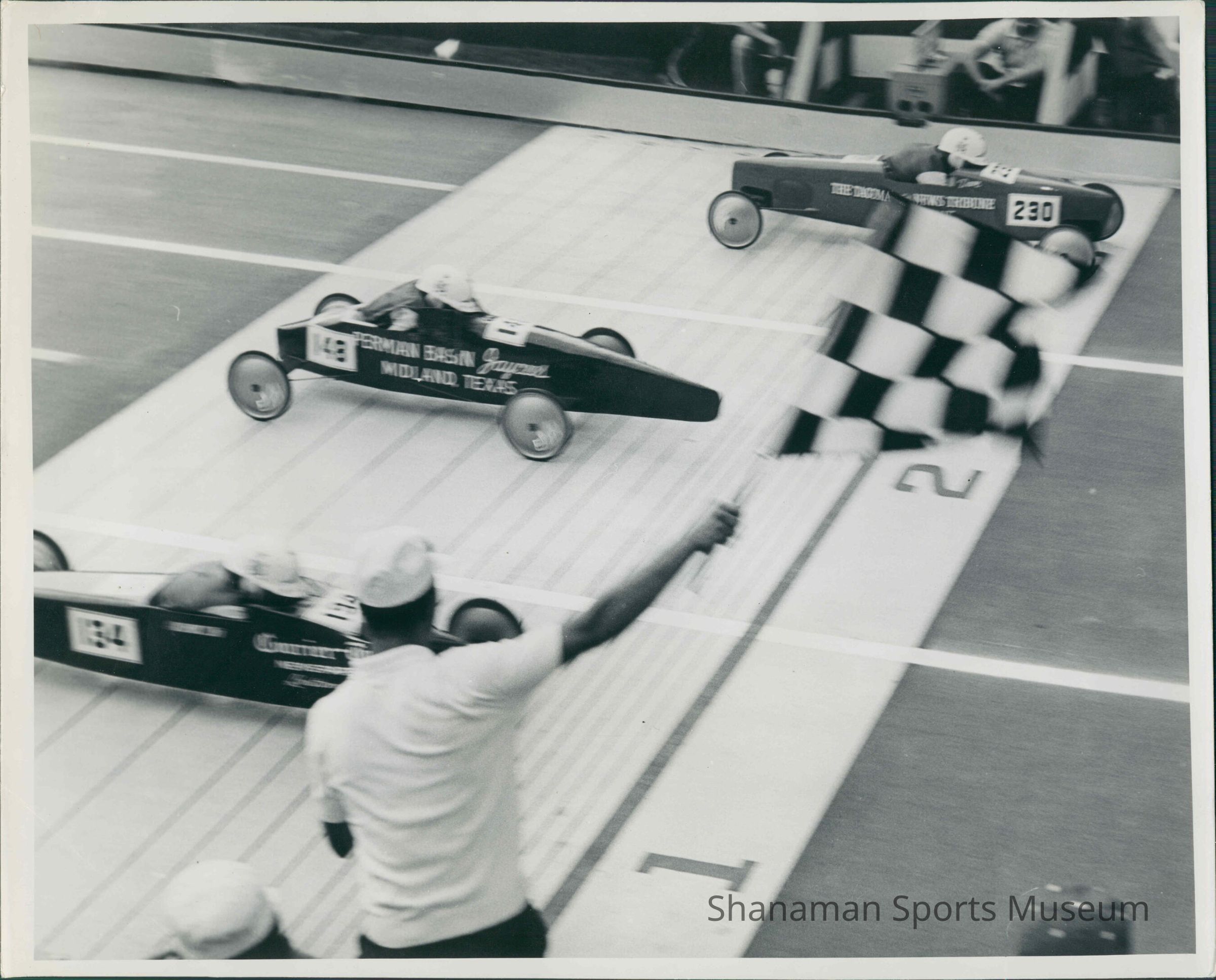 David Krussow takes the checkered flag and crosses the finish line first to win the National Soap Box Derby in 1966. The prestigious race began in 1933 when Myron Scott put together a soap box derby race for 19 boys in Dayton, Ohio. That same year in a repeat race it grew to 362 and it went on to be a national championship, drawing thousands of racers from across the country. The 1954 Soap Box Derby national winner, Denny Zimmerman of Hartford, Conn., went on to race in the Indianapolis 500 and was named the rookie of the year in 1971.Lexicon