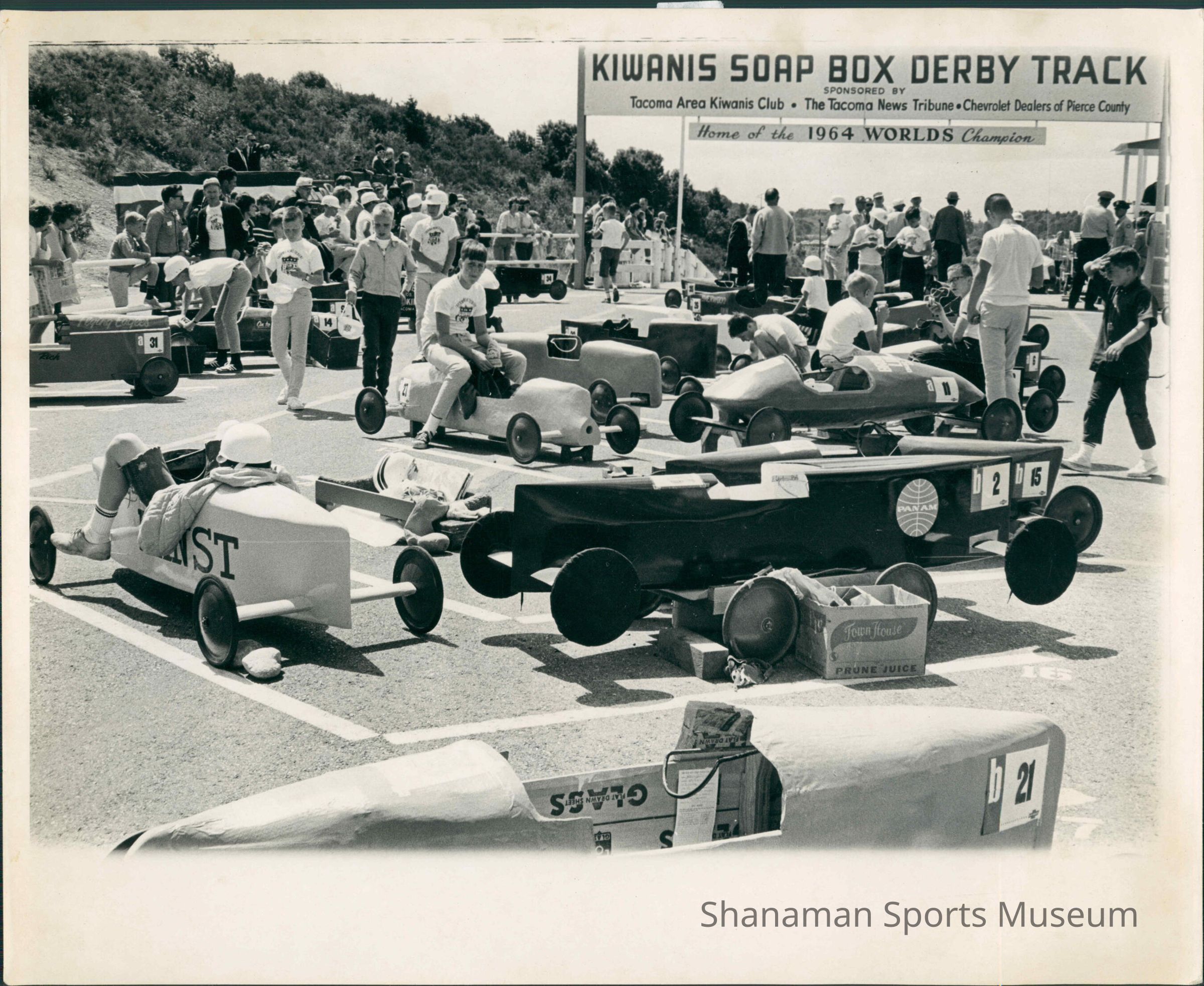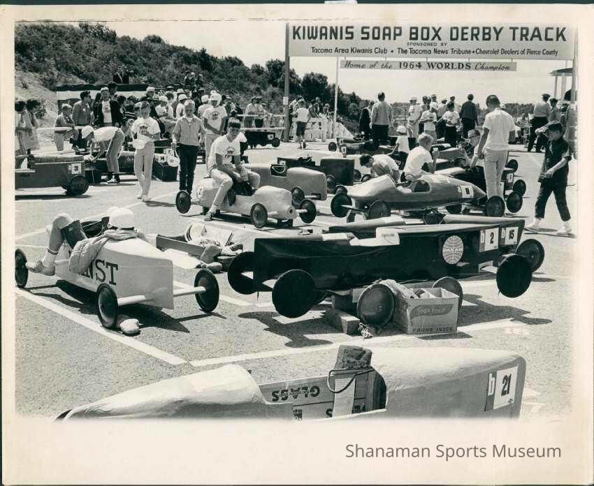 In this picture, drivers sit in their derby cars as they await the start of the Tacoma Kiwanis Soap Box Derby in 1966. David Krussow won the race that year and went on to win nationals in Akron, Ohio. The local race became a popular event, which was near Cheney Stadium, but it has stopped and is no longer done. Derby cars are homemade and run on gravity. No motor is used. The national championship event in Akron, Ohio, became a celebrate draw. Movie star Jimmy Stewart made the most appearances with six visits. Rock Hudson, Tom Hanks, Diana Shore and comedians Bud Abbott and Lou Costello also came to the race.Lexicon