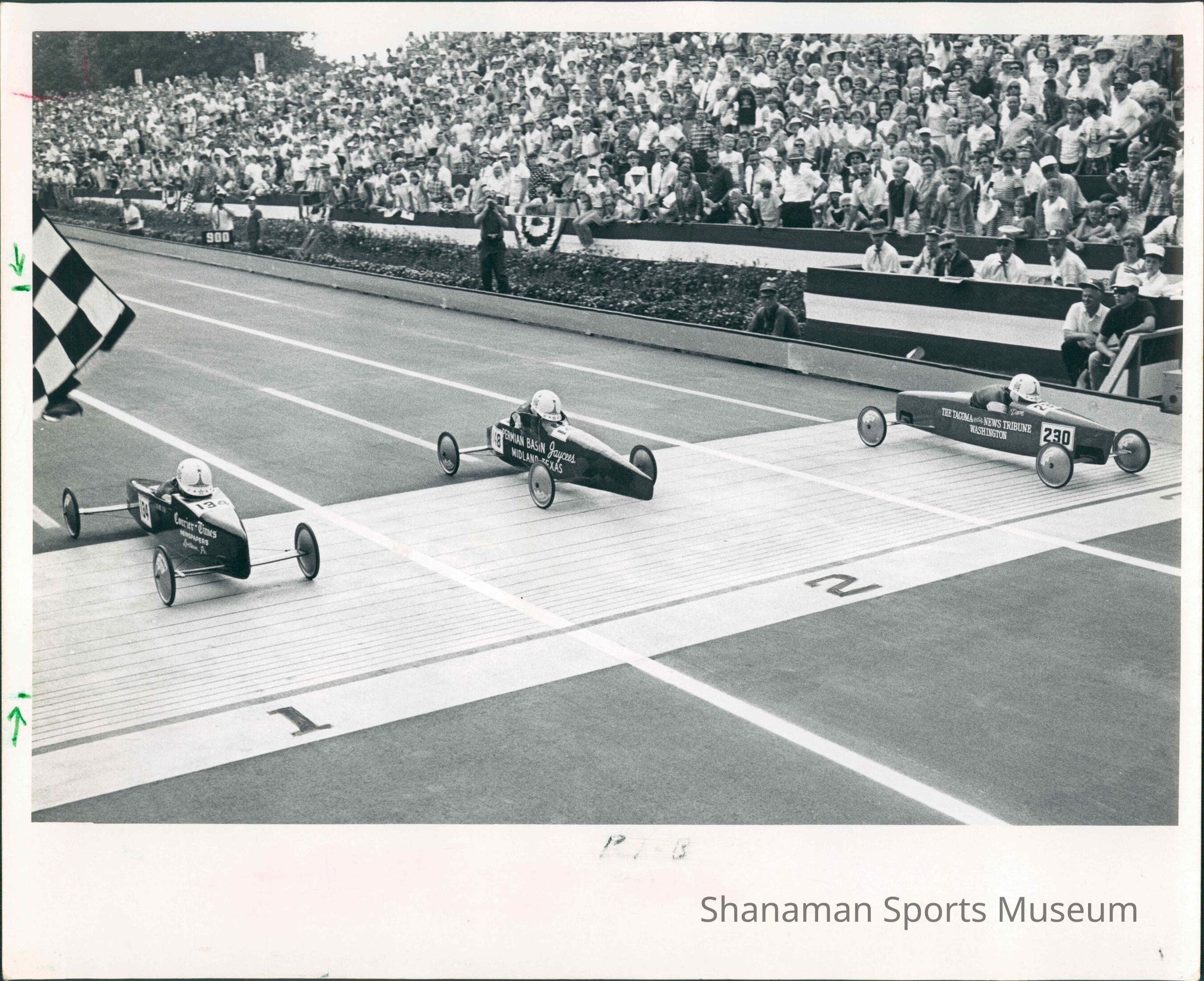 With a packed crowd cheering, a 12-year-old David Krussow crosses the finish line first to win the 1966 National Soap Box Derby, winning by the length of his homemade derby car. Each year about 320 local camps from across the counttry compete at nationals. The most states represented in a single year was 1966 when local champs from 46 states raced at nationals. Only four cities were repeat competitors in each of the first 75 races. They were Akron, Cleveland, Indianapolis and Anderson, Indiana. Champs from Akron to advance to nationals have won the national title 16 times, which is more than any other city.Lexicon