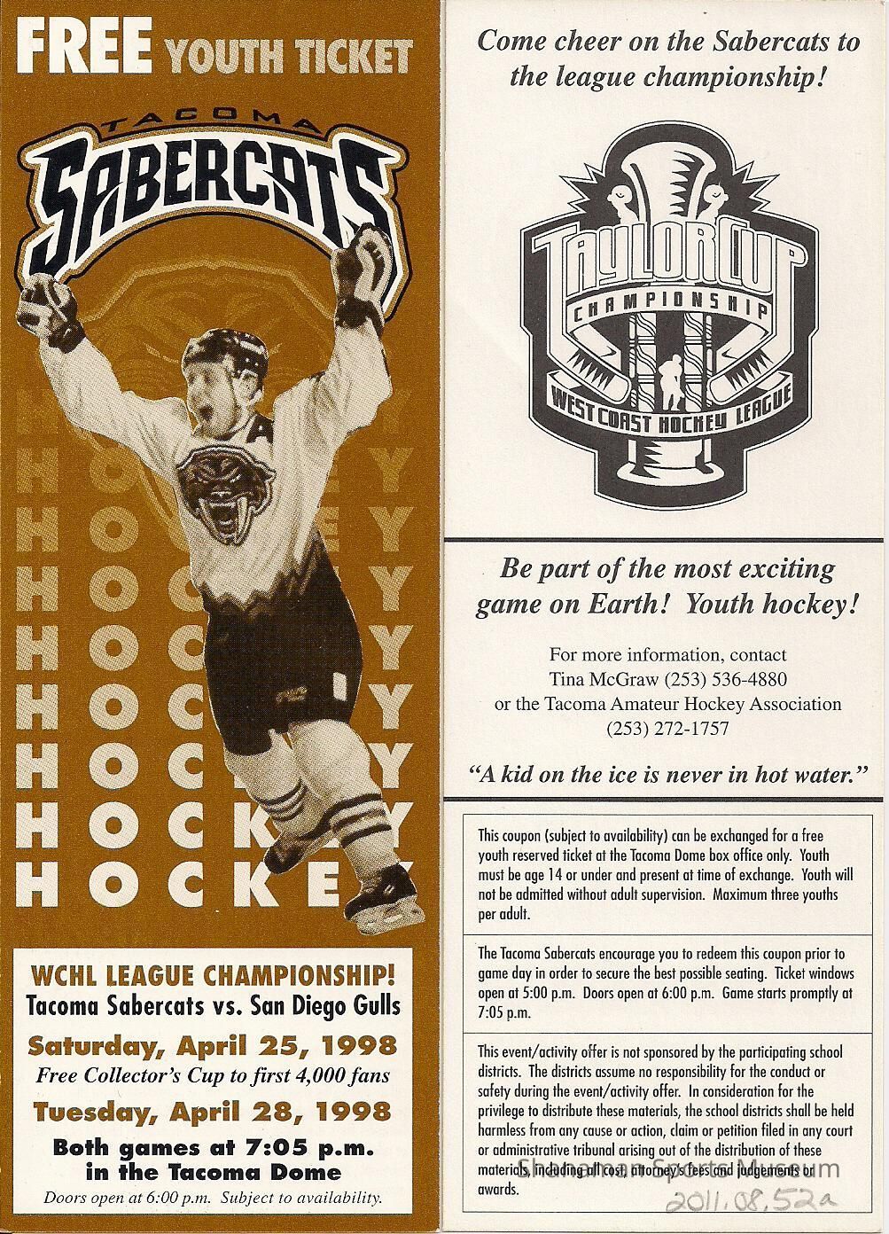 Tickets to a Tacoma Sabercats hockey game. Free Youth Tickets for the WCHL League Championships against the San Diego Gulls on April 25th and 28th, 1998. The Sabercats were the 1998-1999 WCHL Taylor Cup Champions.Lexicon