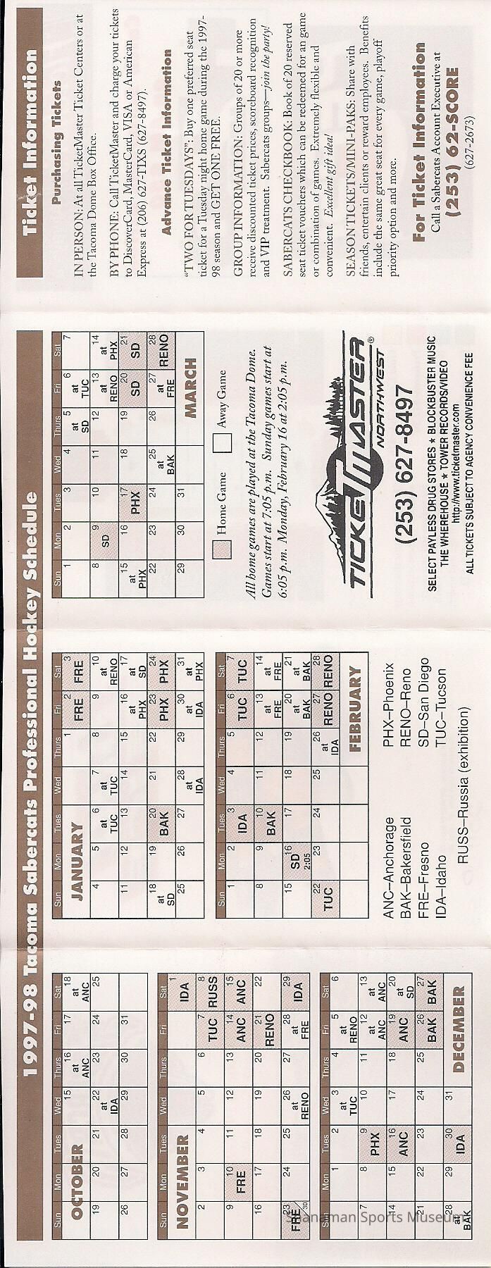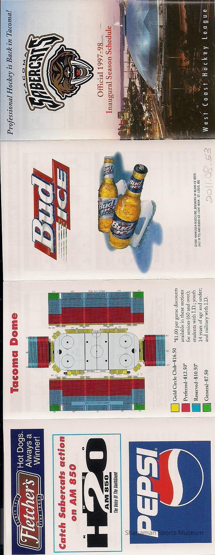 Official 1997-1998 inaugural WCHL season pocket schedule for the Tacoma Sabercats hockey team. The Sabercats were the 1998-1999 WCHL Taylor Cup Champions.Lexicon