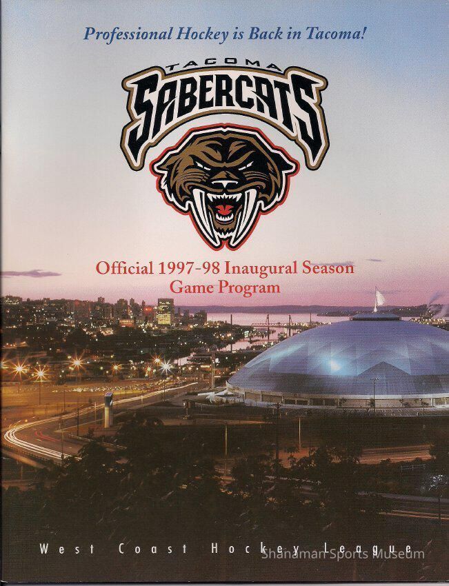 Official 1997-1998 inaugural WCHL season game program for the Tacoma Sabercats hockey team. The Sabercats were the 1998-1999 WCHL Taylor Cup Champions.Lexicon