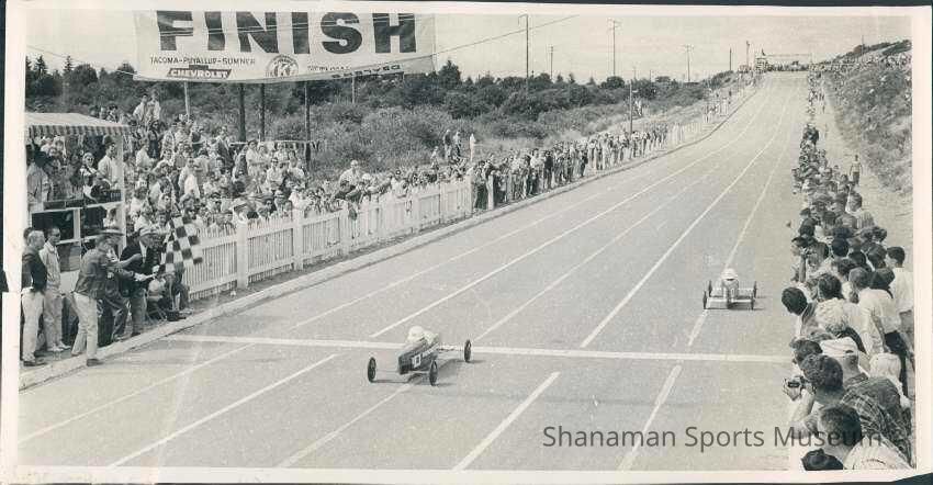 David Krussow races across the finish line to place first at the 1966 Tacoma Soap Box Derby.