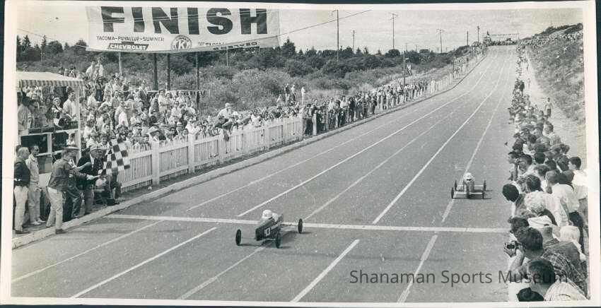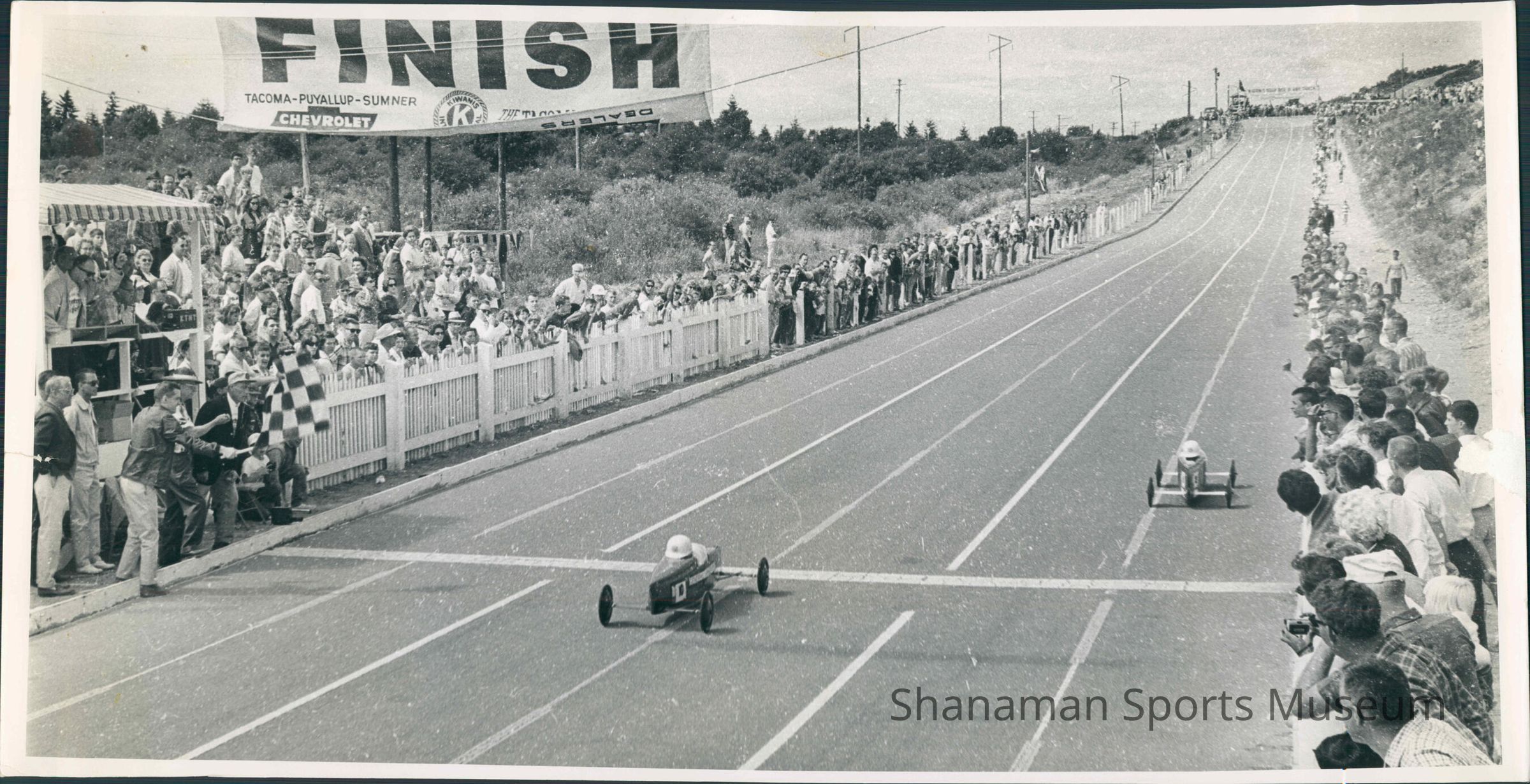 Taking the checkered flag, David Krussow crosses the finish line first in his race at the Tacoma Soap Box Derby in 1966. The race track is near Cheney Stadium and fans lined the track to watch. There were bleachers at the finish line. Tacoma began holding a soap box derby race back in the 1930s, but the city no longer puts on the event. A 10-year-old Floyd Riggs won the Tacoma Soap Box Derby back in 1936 and competed at the national championships in Akron, Ohio.Lexicon