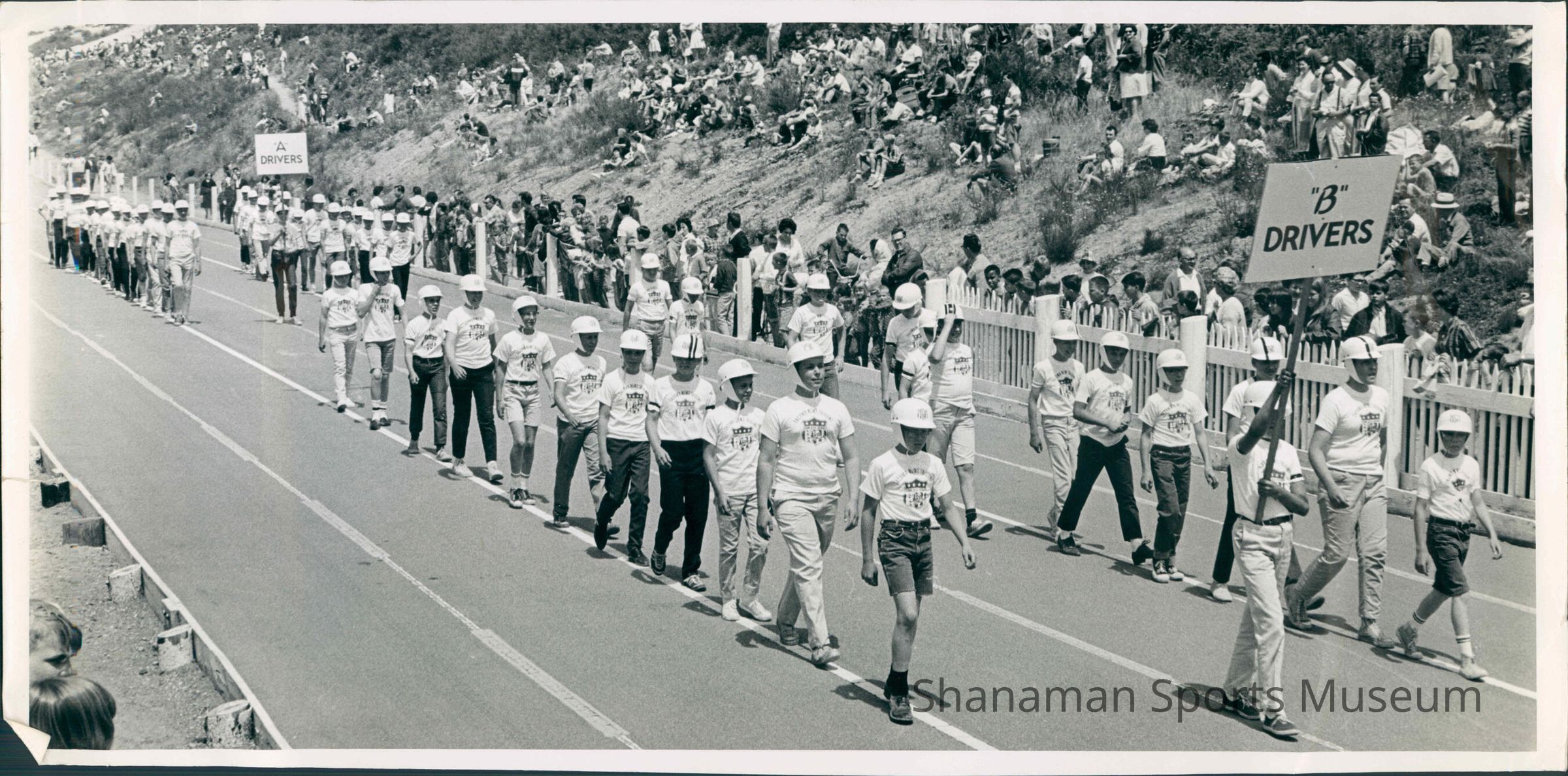 During their introduction prior to the 1966 Tacoma Soap Box Derby, drivers parade down the lanes at the race track which is still by Cheney Stadium near Fircrest. However, the event is no longer held. Racers from about 320 local races across the country competed to qualify for the national championship race at Akron, Ohio, that's held every July. During the 1950 and 1960s, the national championship race would draw 70,000 fans from across the country.Lexicon