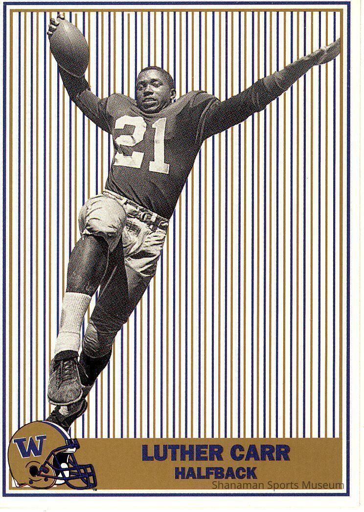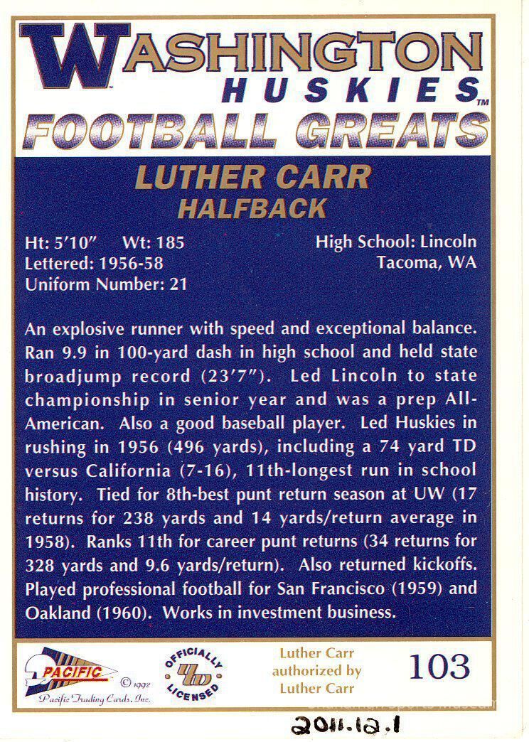 Football Trading Card- Luther Carr, halfback for the University of Washington 1956-1958. He played football at Lincoln High School. Card is a 1992 Wasington Huskies Football Greats.