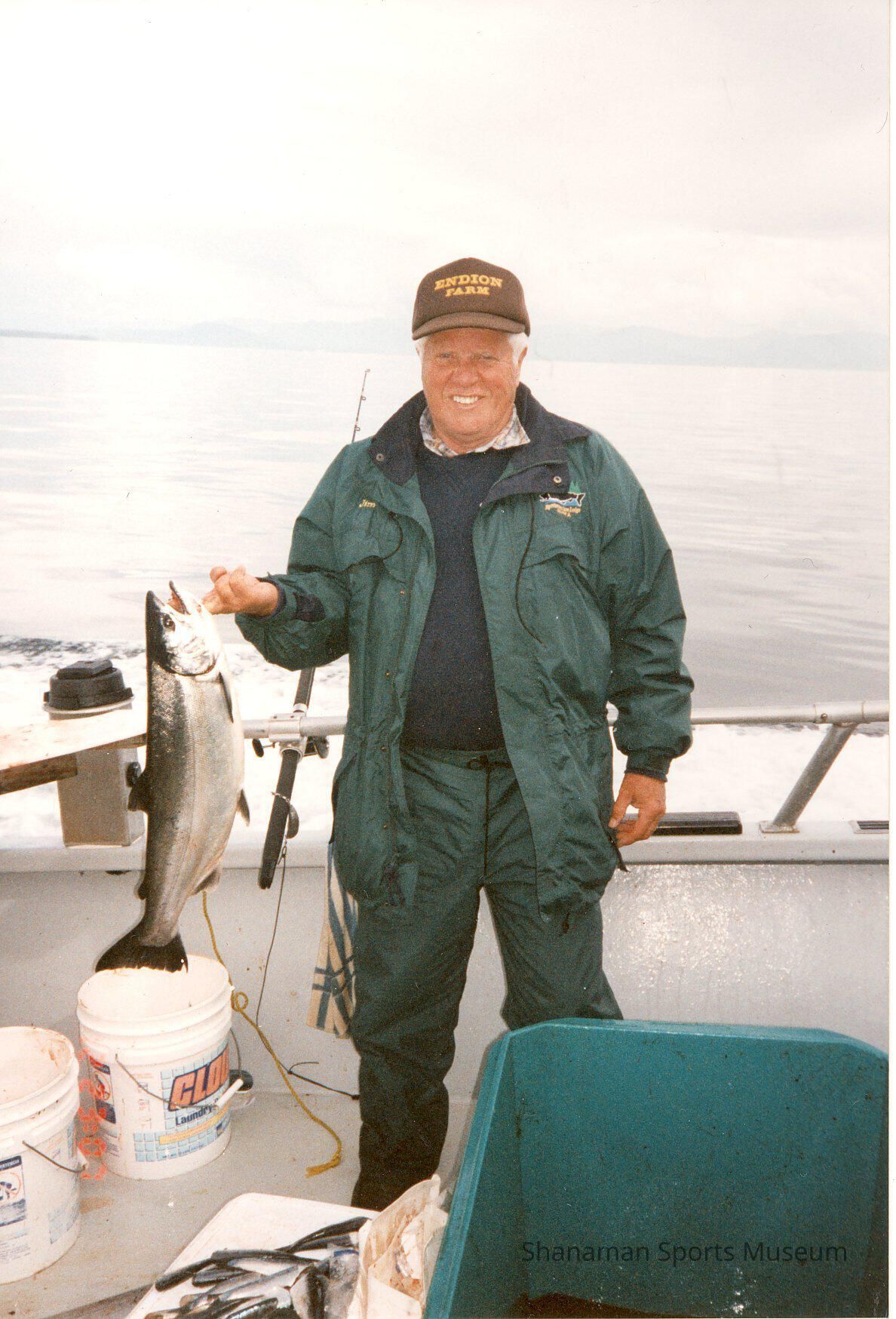 Jim Topping, holding a fish as he stands in a boat, was part of Baseball Tacoma, Inc., which received the Dill Howell Award in 2006.