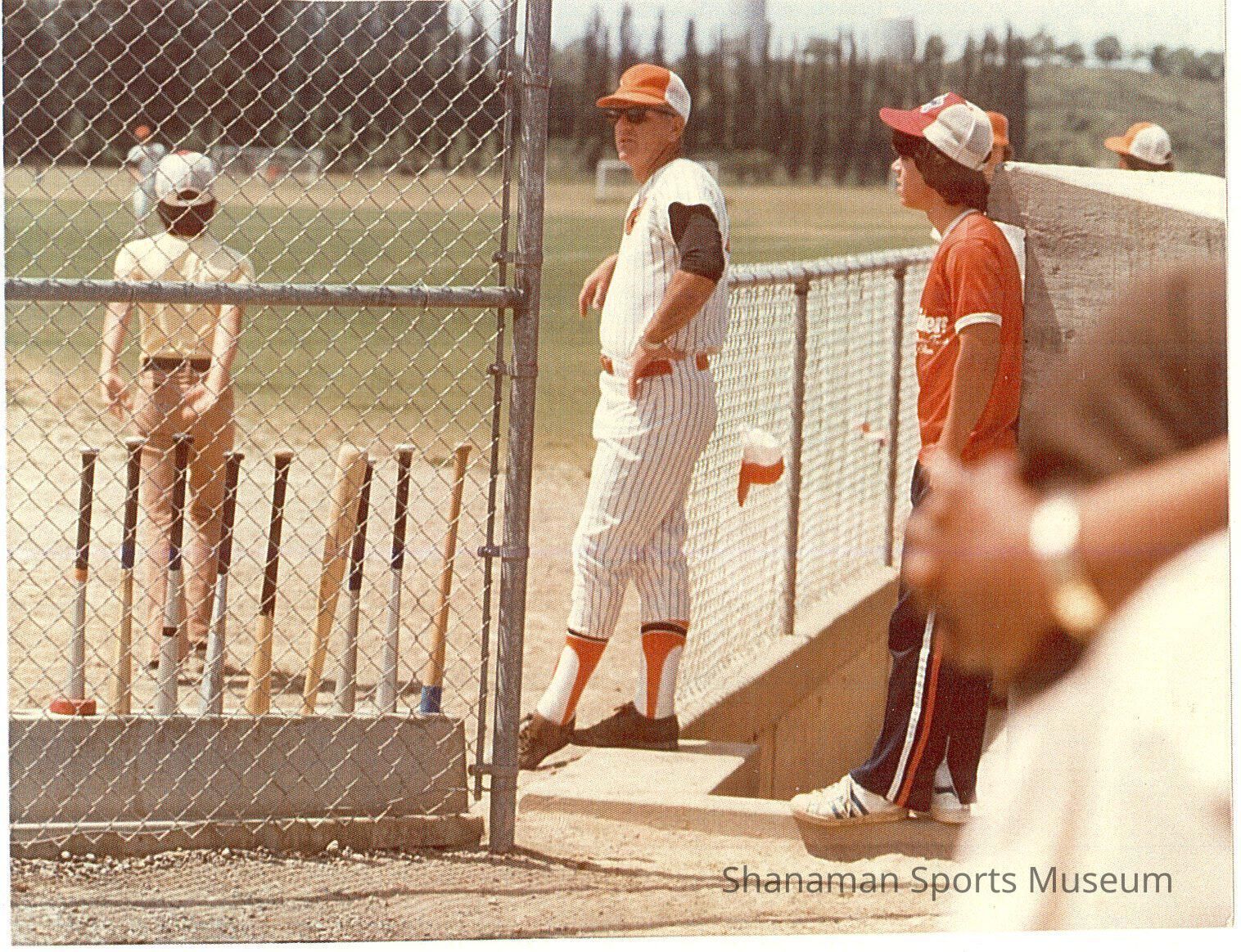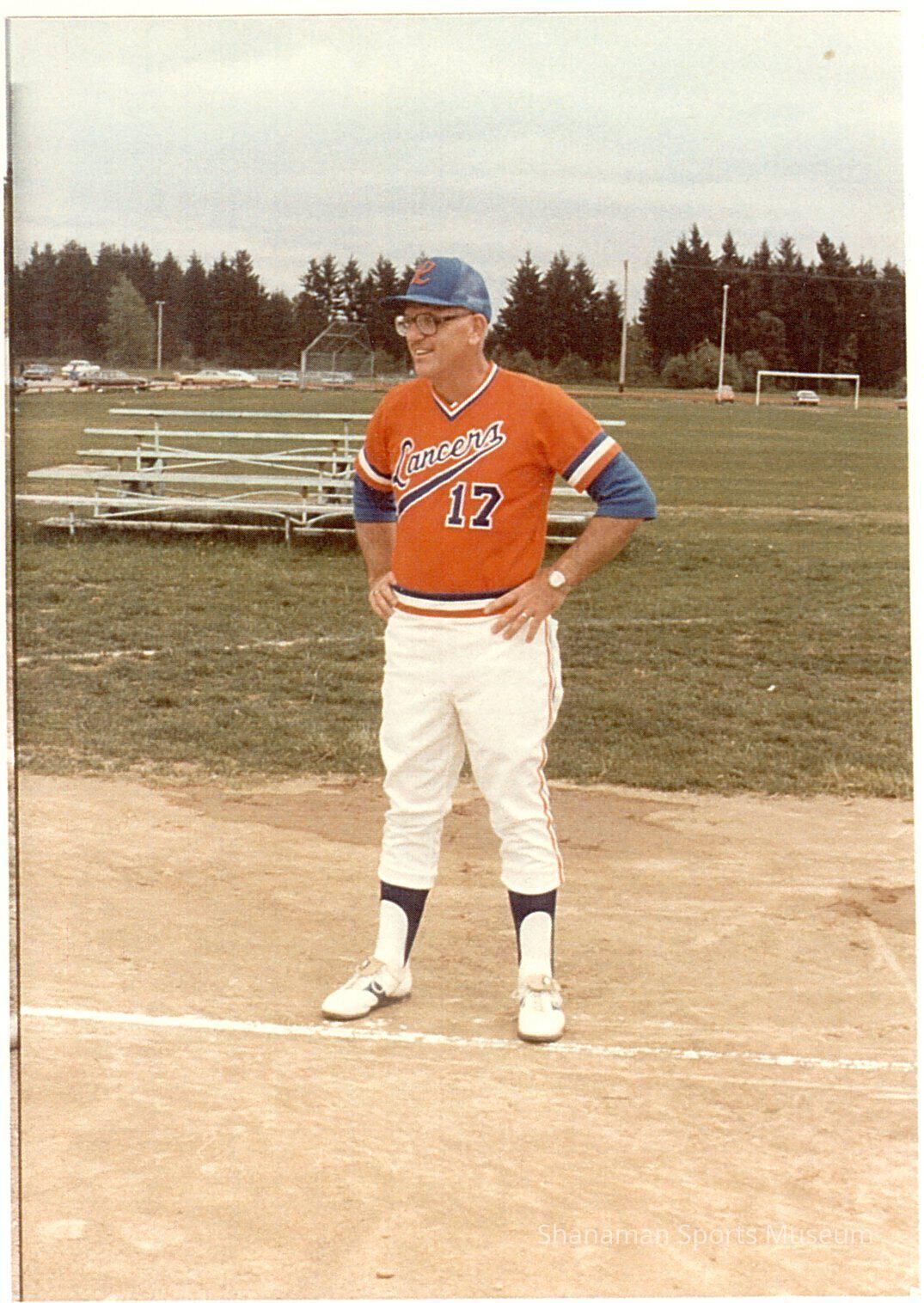Ed Hardenbrook, coach of the 1978 Lakes High School baseball team, is shown in two photographs, one wearing a white pinstriped jersey, the other a uniform with an orange jersey and white pants with orange and blue stripes along the leg. The Lancers finished second in state the following season.