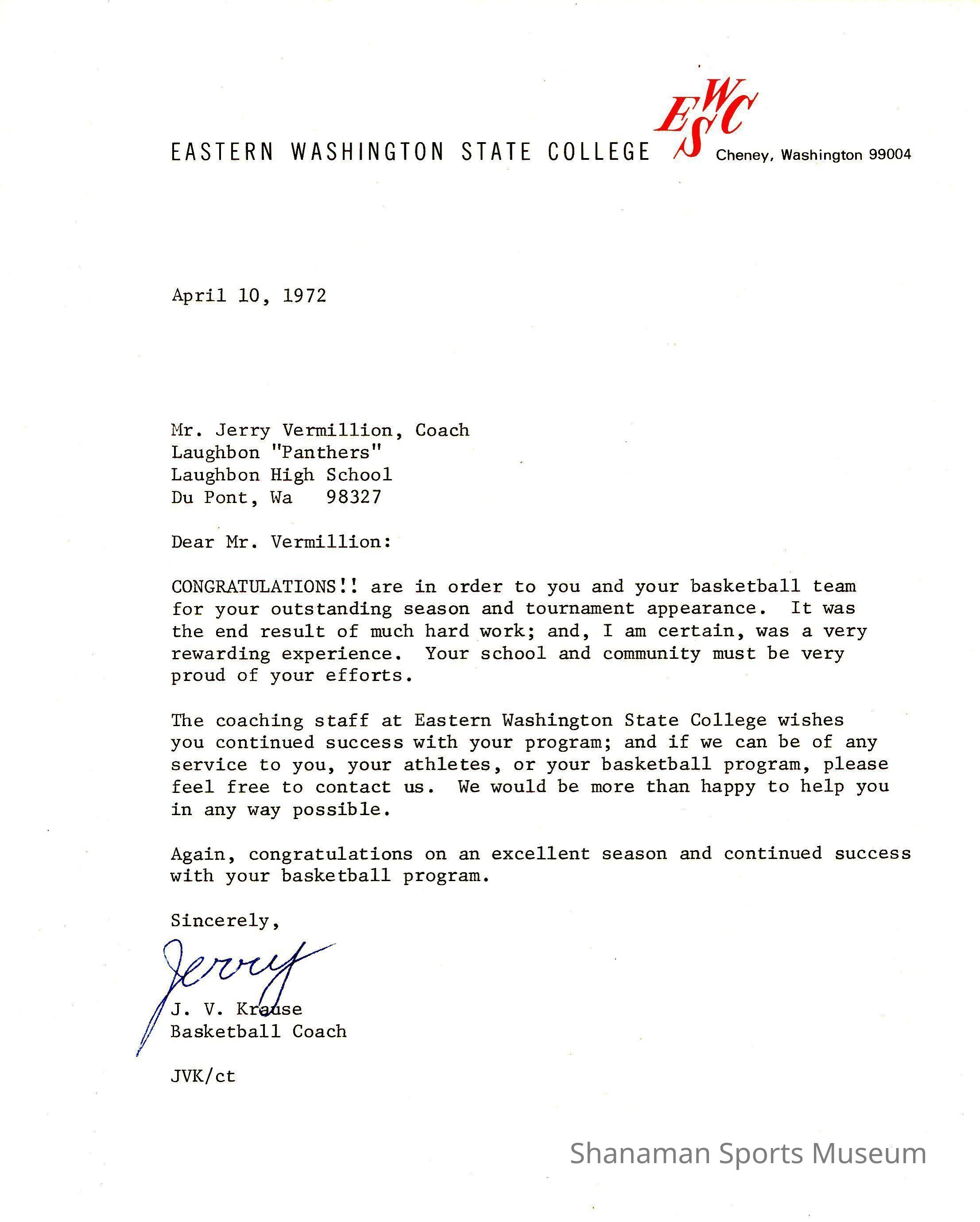 Letter- from J.V. Krause, basketball coach of Eastern Washington State College to mens basketball coach Jerry Vermillion of Laughbon High School congratulating him on the championship season, April 10, 1972.