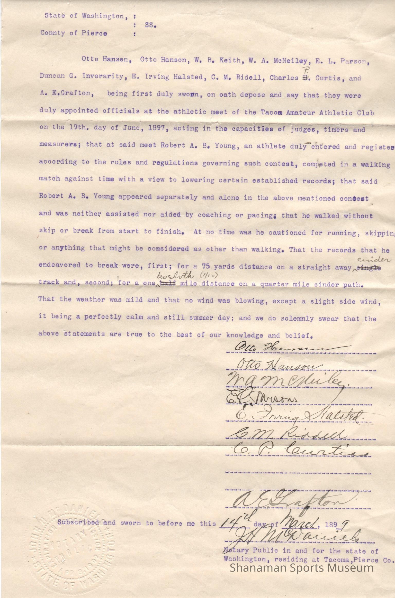 Letter- racewalking- signed affidavit from appointed officials stating the on June 9, 1897, R.A.B. Young walked 75 yards correctly. The letter describes the weather and track conditions. March 14, 1899.Lexicon