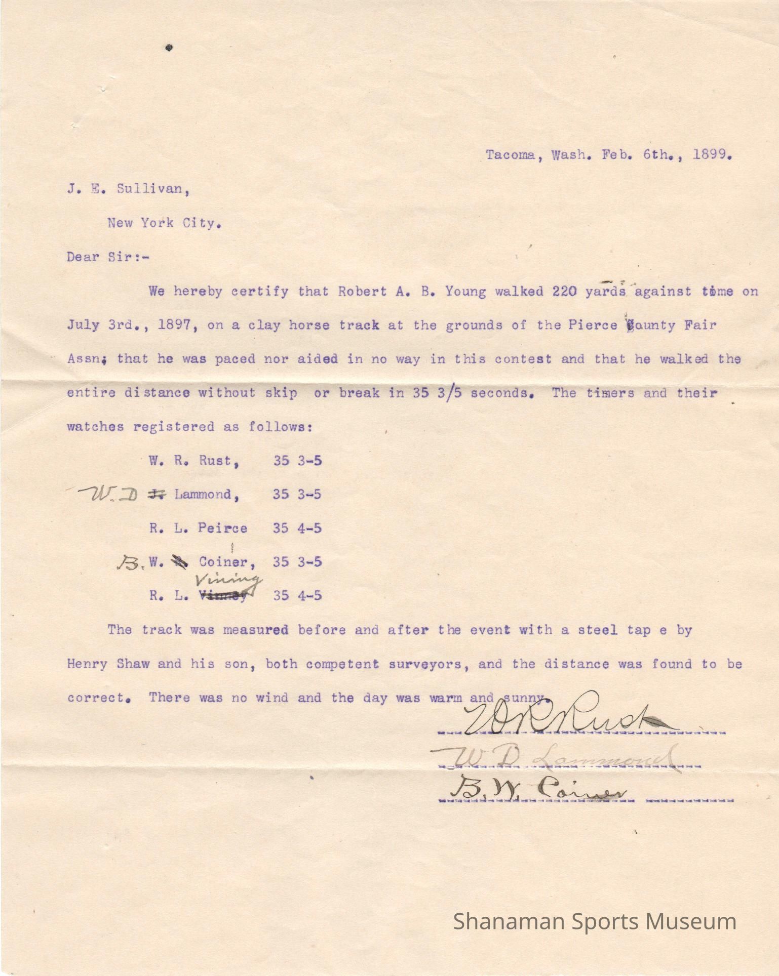 Letter- affidavit signed by racewalking officials that R.A.B. Young walked 220 yards in 35 3/5 seconds on July 3, 1897. This walk set a new world record.