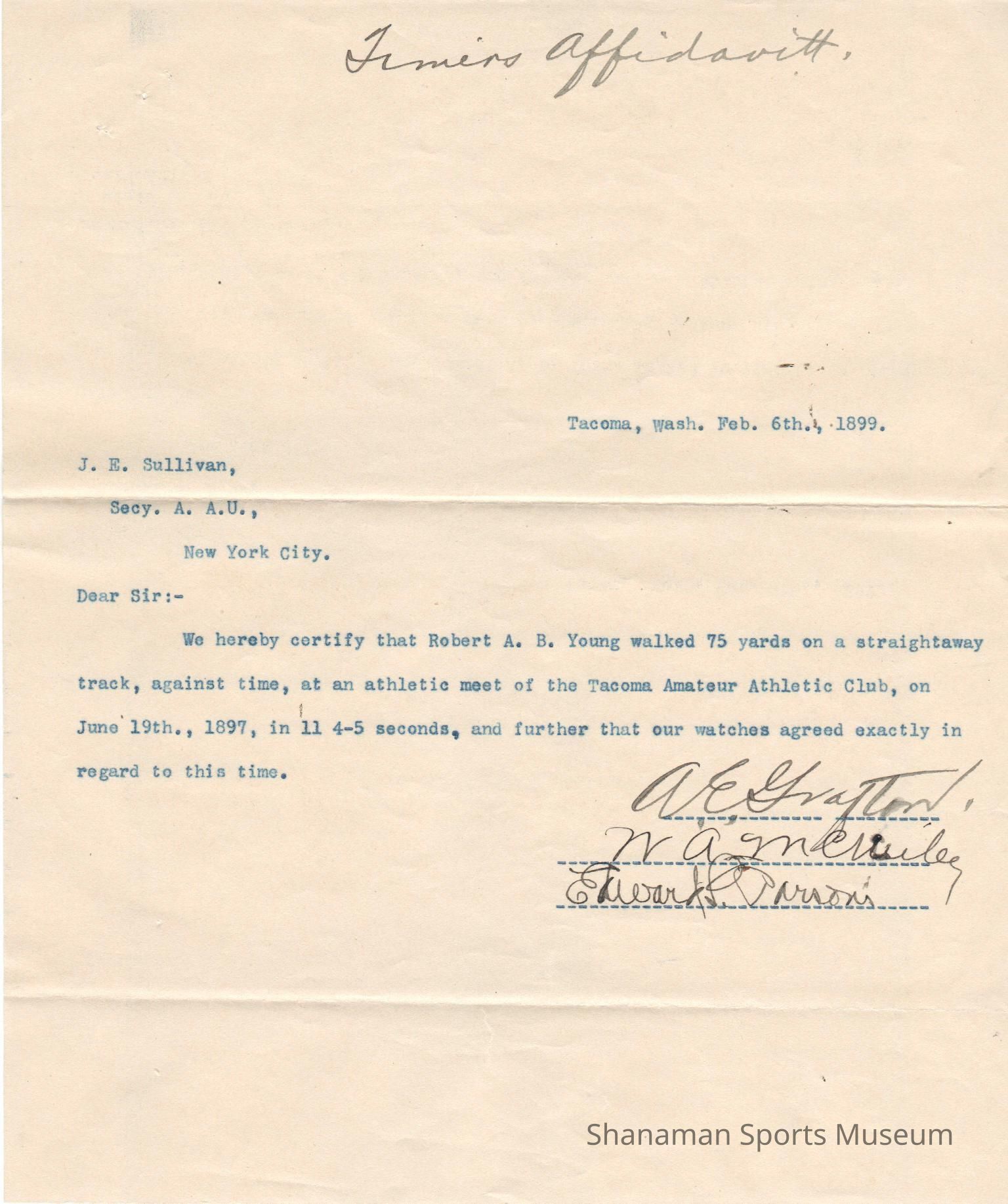 Letter- affidavit signed by racewalking officials that R.A.B. Young walked 75 yards in 11 4/5 seconds on June 19, 1897.