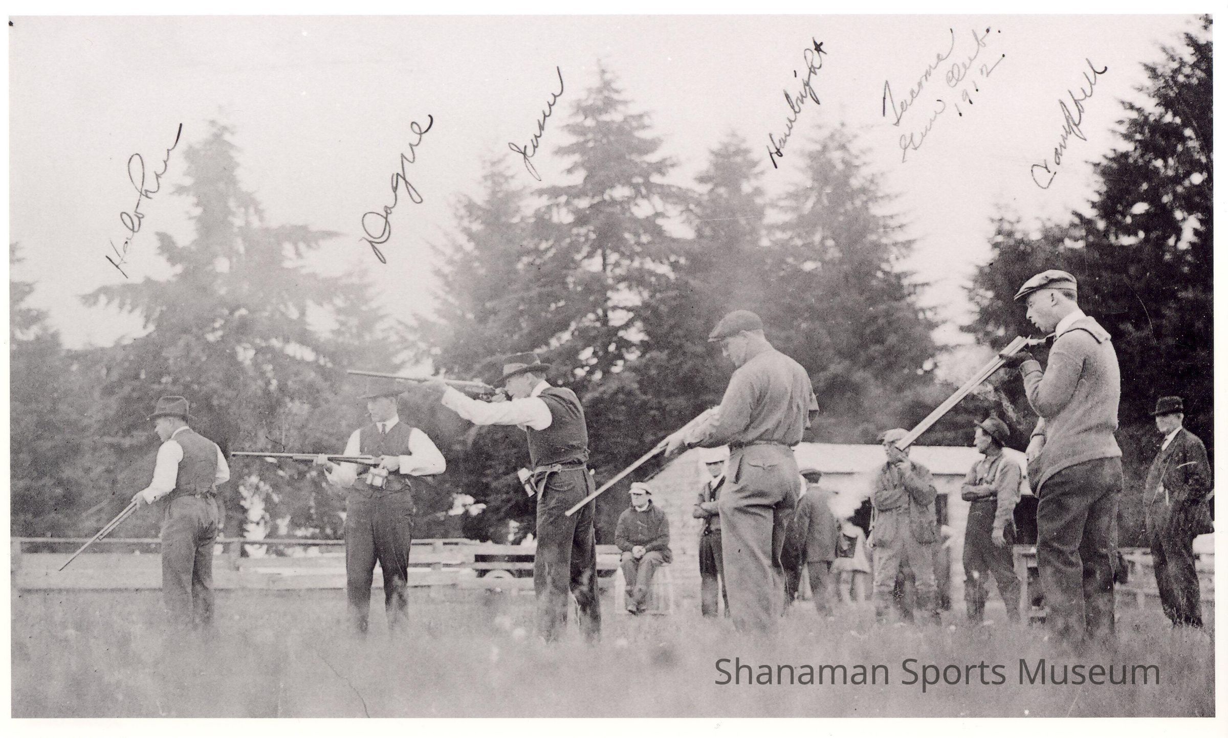 Men firing rifles at the Tacoma Gun Club. As was the style back then, the men wore ties and are dressed up. According to a story in the Tacoma Times on March 31, 1909, the Tacoma Gun Club was the name of a new organization just formed and opened a a shooting range at Gardendale near Puyallup. The photo is signed by some of the men in the photo.Made/Created