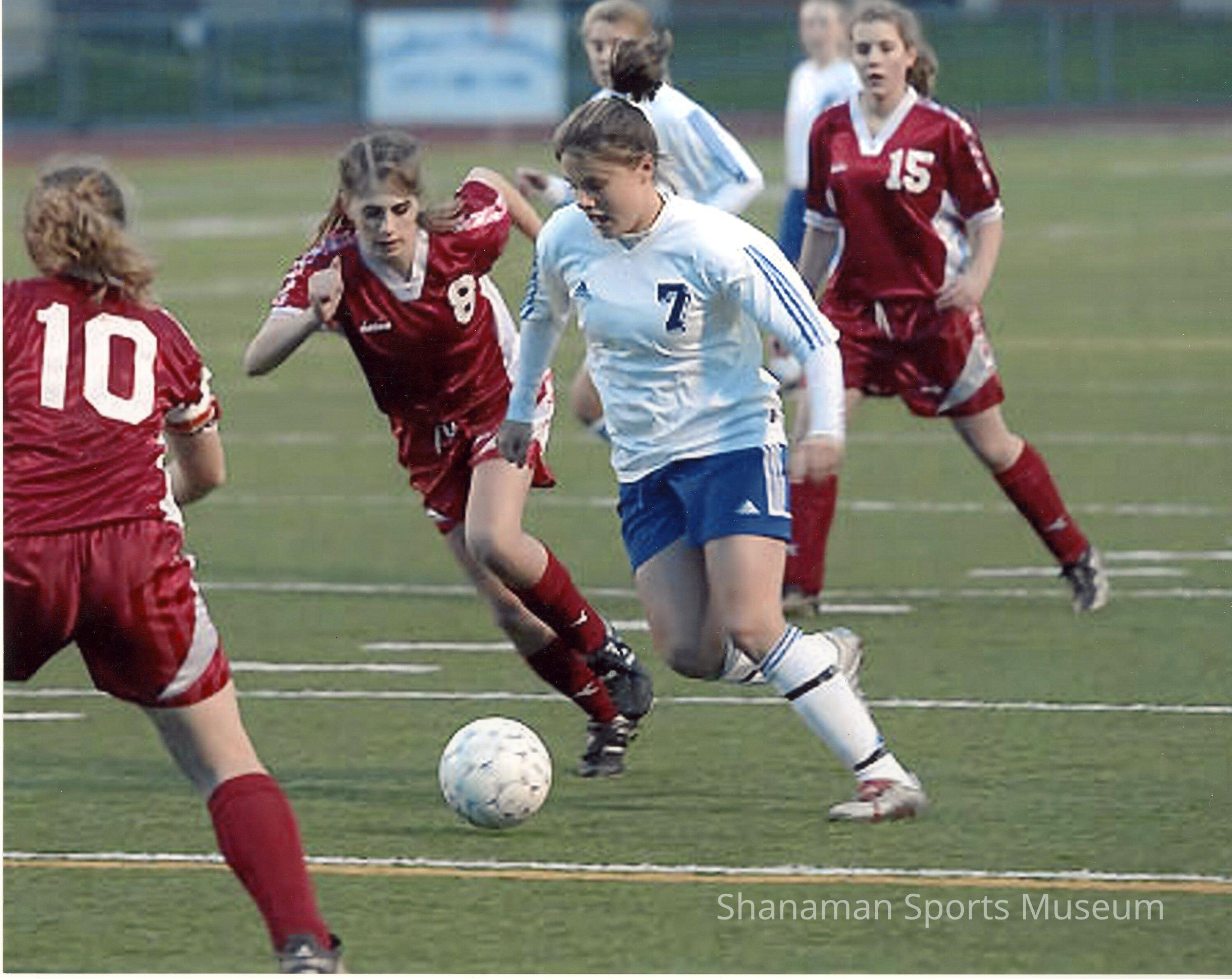 Senior Jenny Baker of Eatonville High School (No. 7 white jersey) dribbles through defenders in this 2005 match. The Cruisers went on to capture the Class 2A state championship that season, beating East Valley of Yakima 4-3 in the title game. Baker scored three goals in that match, bringing her career total to 146 goals -- at the time No. 3 in Washington state history. She was a two-time all-state selection and the 2A State Player of the Year as a senior, ultimately going into the Eatonville Athletic Hall of Fame in 2016. Baker signed with Central Florida University, but transferred to the University of Oregon and played one season there as a reserve before finishing her career at Saint Martin's University in Lacey in 2009 and '10. Baker flourished as a senior, earning All-GNAC first-team honors after receiving an honorable mention in 2009. She ranks fourth in school history with most points in a single season (24), fourth in points per game in single season (1.33), tied for third in most goals in a single season (11), third goals per game in a single season (0.61) and tied for third in game winning goals in a single season (3). Additionally, Baker ranks fifth all-time in school history in points (33), second in points per game (0.97), fifth in goals scored (15), second in goals per game (0.44) and tied for second in game-winning goals (5).Lexicon