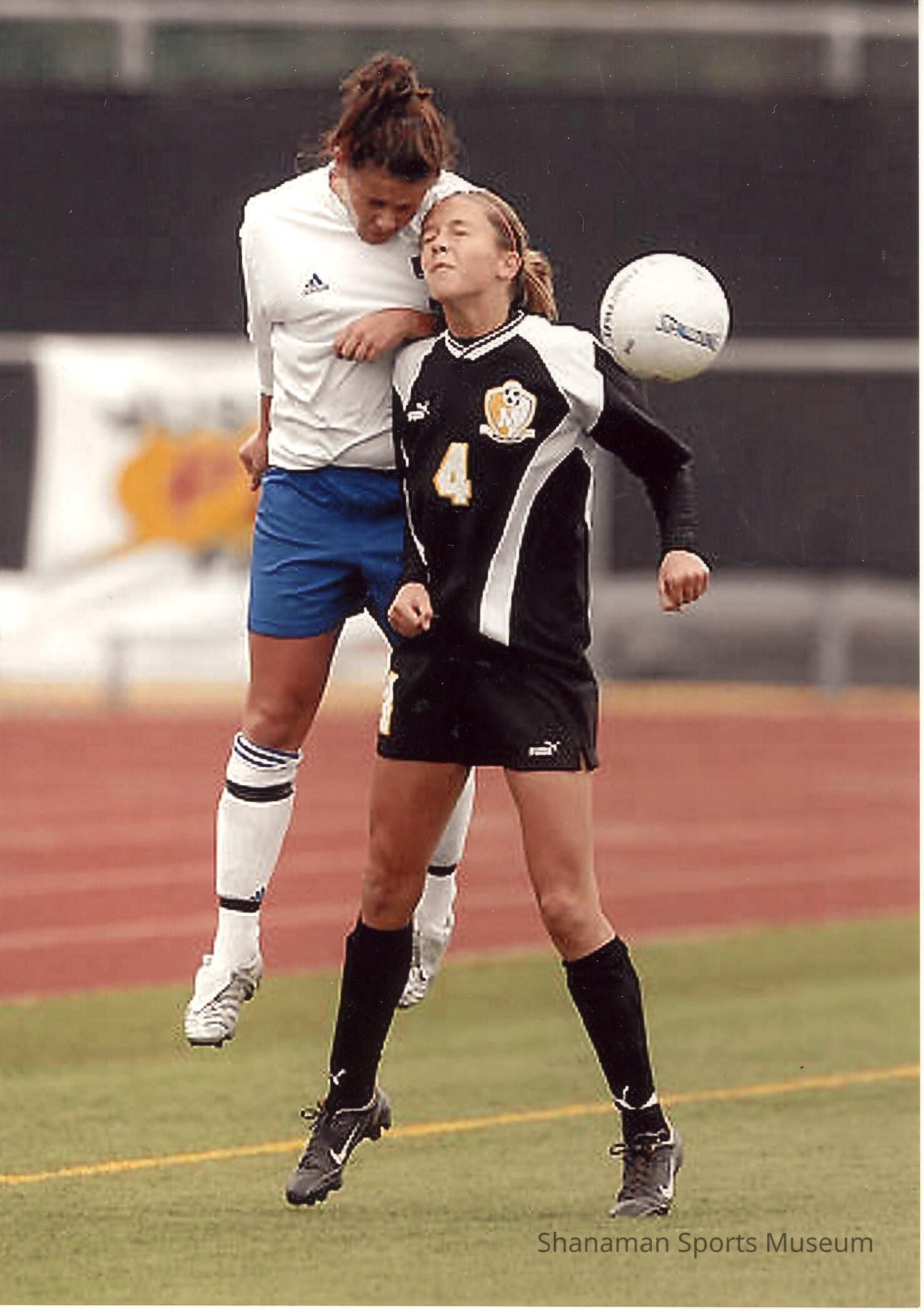 Jenny Baker (in white jersey) heads a soccer ball past a defender during an Eatonville High School match. She was a four-year star for the Cruisers from 2002-05, leading them to the Class 2A state championship as a senior. Eatonville defeated East Valley of Yakima 4-3 in the title game as Baker scored three goals, bringing her career total to 146 goals -- at the time No. 3 in Washington state history. Baker was a two-time all-state selection and the 2A State Player of the Year as a senior, ultimately going into the Eatonville Athletic Hall of Fame in 2016. She signed with Central Florida University, but transferred to the University of Oregon and played one season there as a reserve before finishing her career at Saint Martin's University in Lacey in 2009 and '10. Baker flourished as a senior, earning All-GNAC first-team honors after receiving an honorable mention in 2009. Baker ranks fourth in school history with most points in a single season (24), fourth in points per game in single season (1.33), tied for third in most goals in a single season (11), third goals per game in a single season (0.61) and tied for third in game winning goals in a single season (3). Additionally, she ranks fifth all-time in school history in points (33), second in points per game (0.97), fifth in goals scored (15), second in goals per game (0.44) and tied for second in game-winning goals (5).Lexicon