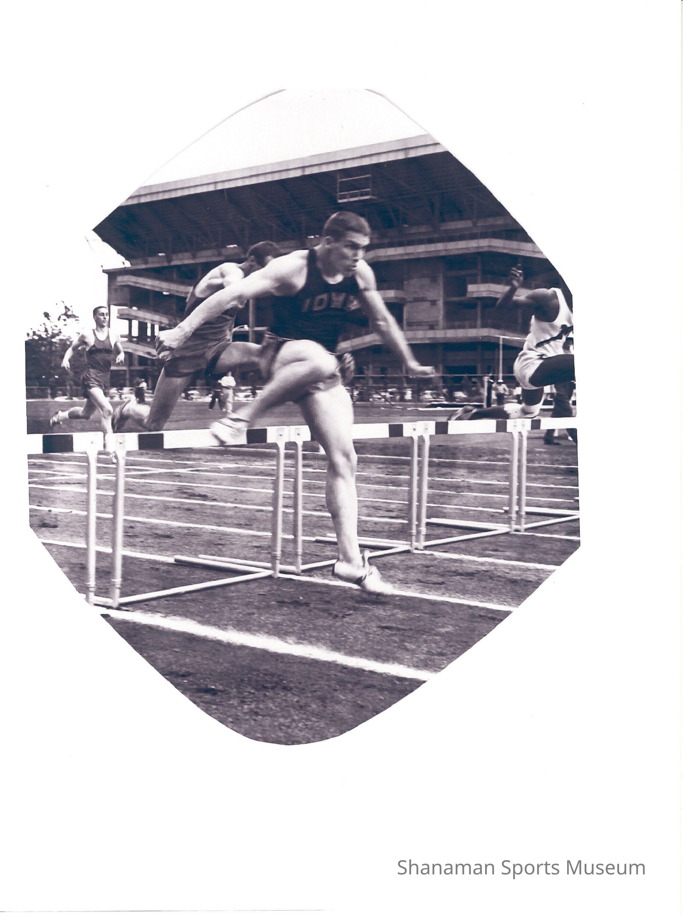 photograph, copy of original, b/w, 7x6" hexagon, Jerry Williams running hurdles at 1960 Outdoor Championships for IOWALexicon