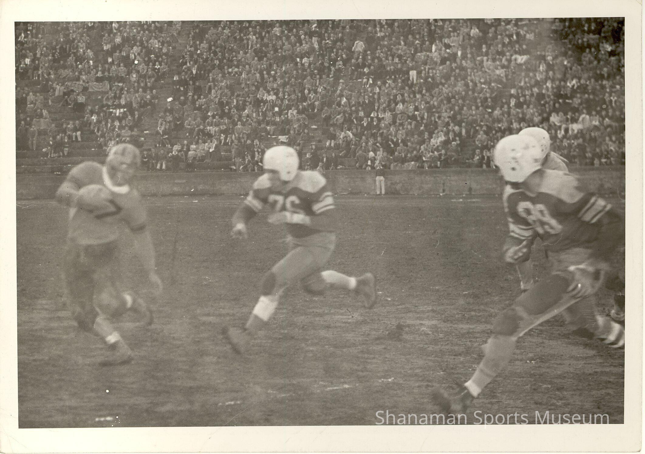 Dick Colombini, No. 47 (with football) played both football and baseball at Lincoln High in Tacoma and at the University of Puget Sound (he previously played at Santa Clara before transferring to UPS). Colombini was named an All-City, All-Cross State and All-State halfback at Lincoln. He also was named all-league in baseball in high school and college. While at Puget Sound, Colombini set a school record with four touchdowns and 25 points in a 58-0 win over Eastern Washington. In 1951, Colombini, a guard for the University of San Francisco football team, joined his teammates and refused an invitation to play in the Orange Bowl in Florida after learning they would have to play without their two African-American players. A documentary, ’51 Dons, was released in 2014, telling the story of the team that was undefeated at the time. Colombini coached and taught at North Kitsap High School in Poulsbo from 1956-62 compiling a record of 38 wins, 15 losses and one tie and went on to become the principal at South Kitsap High School in Port Orchard and assistant superintendent. Colombini is also a member of the Tacoma-Pierce County Old-timers Baseball-Softball Association Hall of Fame (2003)Lexicon