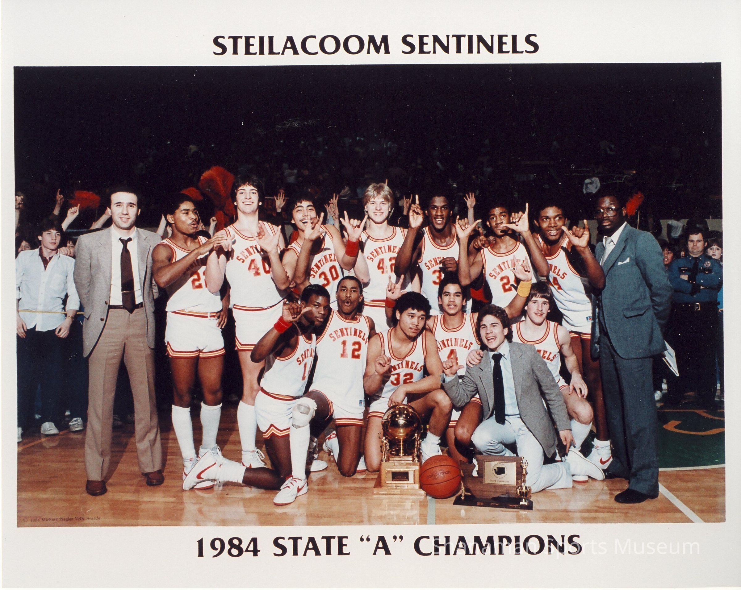 \Coach John Medak and his Steilacoom High School boys basketball team celebrate the school's first state championship on center court at the University of Puget Sound on March 3. The Sentinels beat Woodland in the Class 1A championship game, 68-39, to cap their 24-2 season, which proved to be Medak's final one at the helm.Made/Created