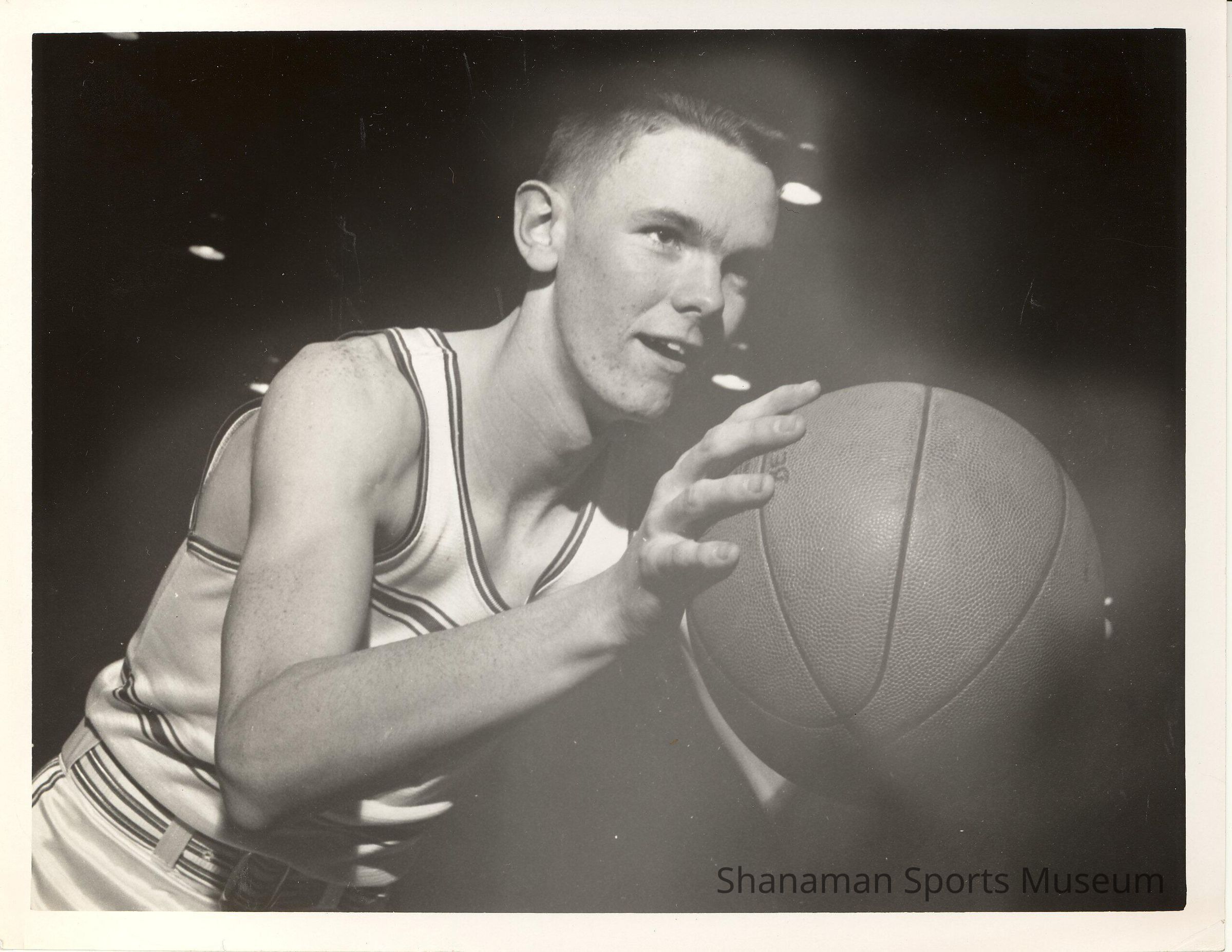 Photo- b/w photo of Don Rowland posing for basketball shot.
