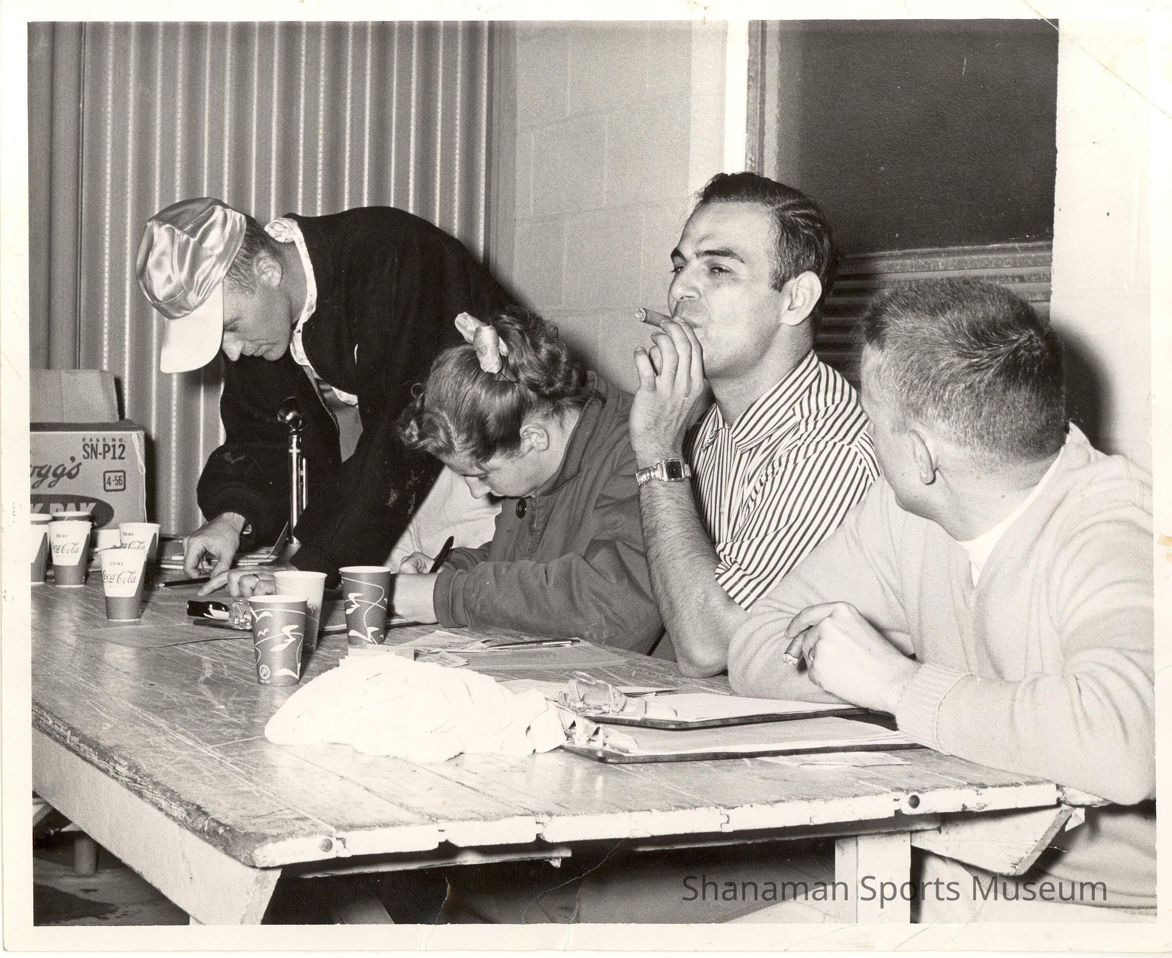 Steve Orfanos, second from right, smokes a cigar at a table as three others sit neat to him.