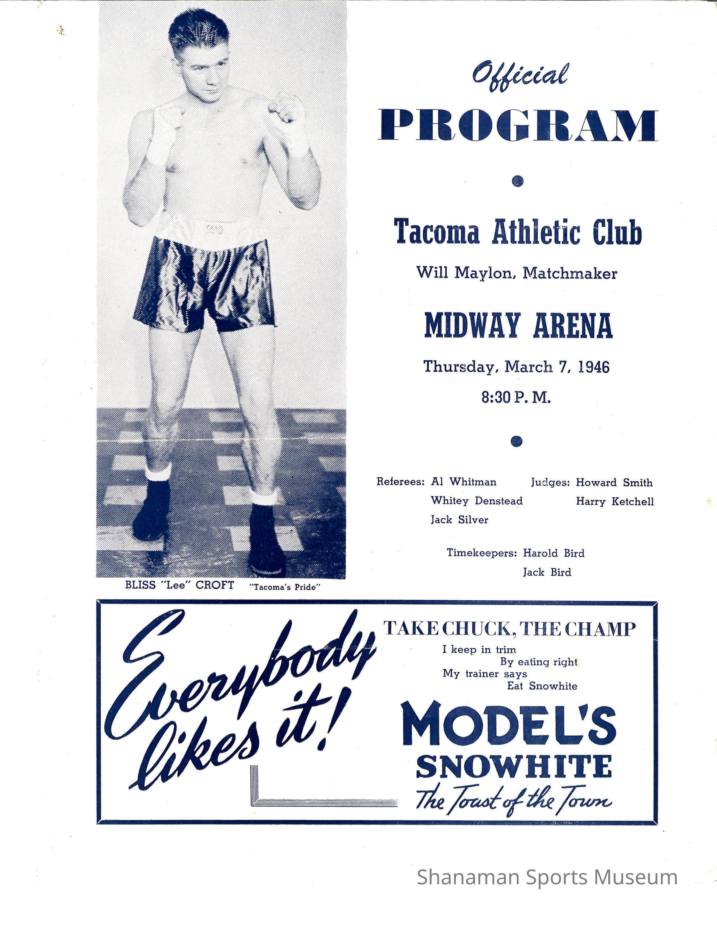 Program, boxing, Main event is Bliss Lee Croft vs. Dave Johnson, March 7, 1946. Croft was a Tacoma native and was an accomplished boxer in the 1940s.Archive Details