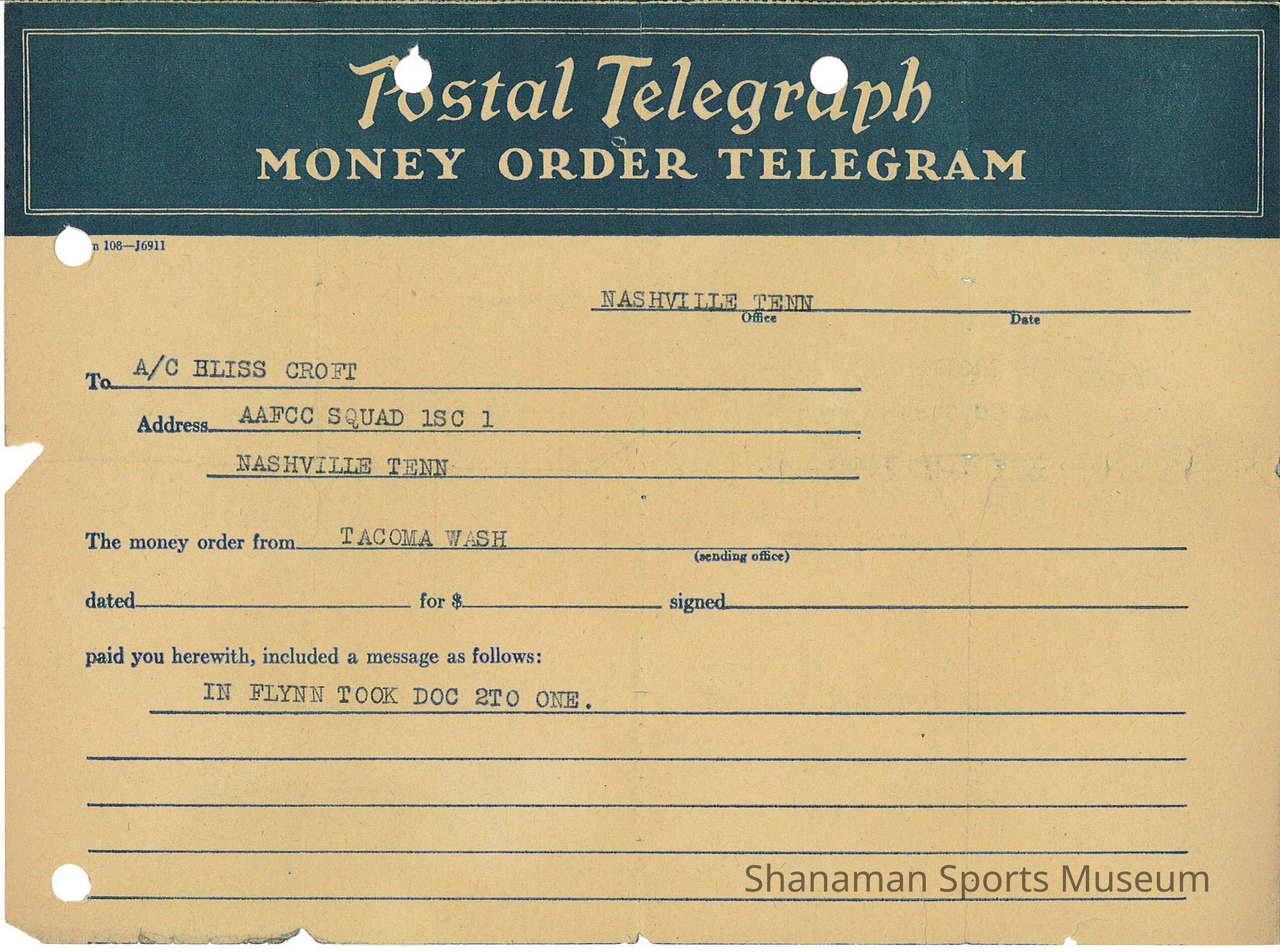 Telegram, to Bliss Lee Croft, while with the air force stationed in Nashville, Tenn. From Tacoma, "In Flynn took Doc 2 to one", c. 1942.Archive Details