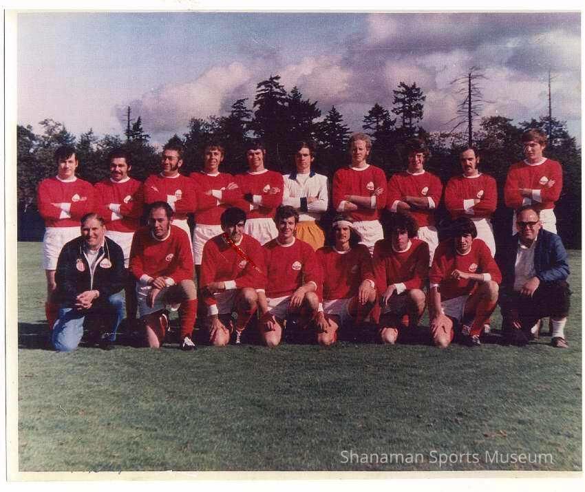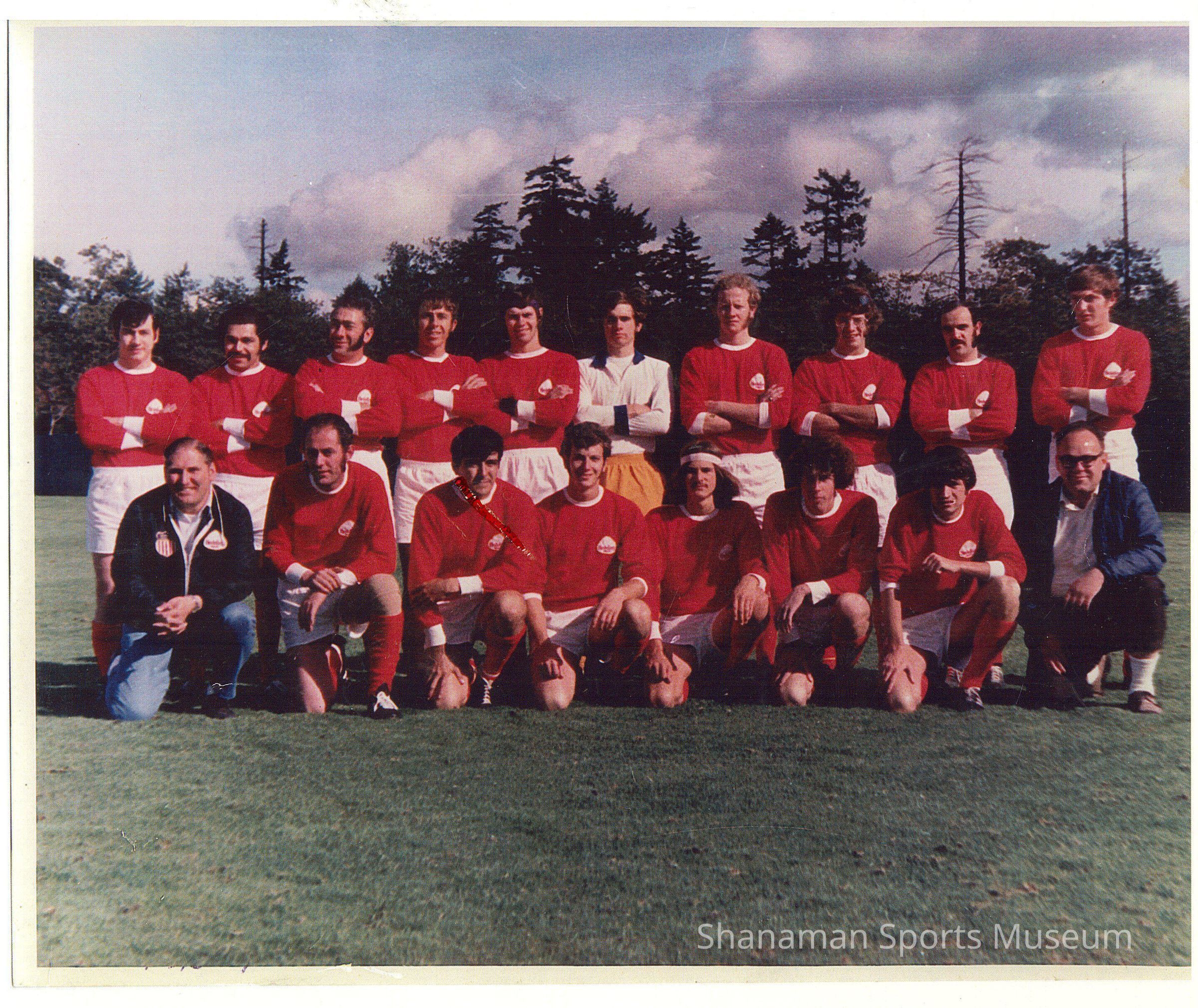 Eighteen members of Norm's state Premier championship team, including two coaches at the end of the front row, pose for a team photograph in the 1970s.