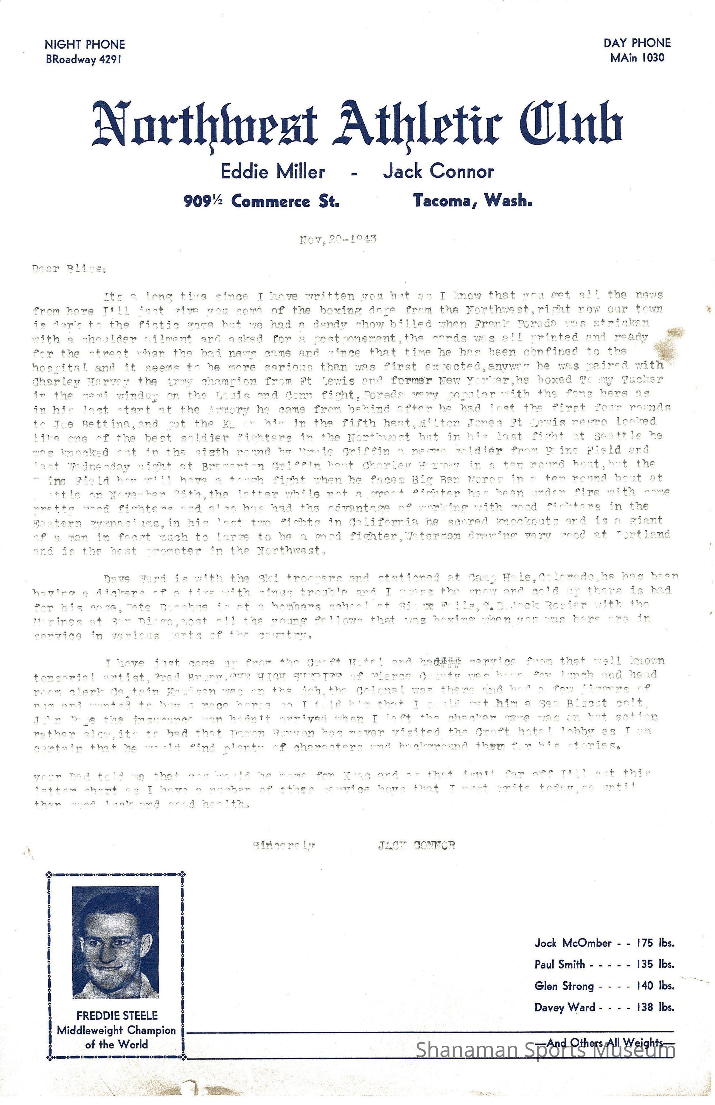 Letter, from Jack Connor of the Northwest Athletic Club to Bliss Lee Croft updating him about boxing in Tacoma while he is away serving in the air force, November 20, 1943. Bliss Croft was a Tacoma native and was an accomplished boxer in the 1940s.Archive Details