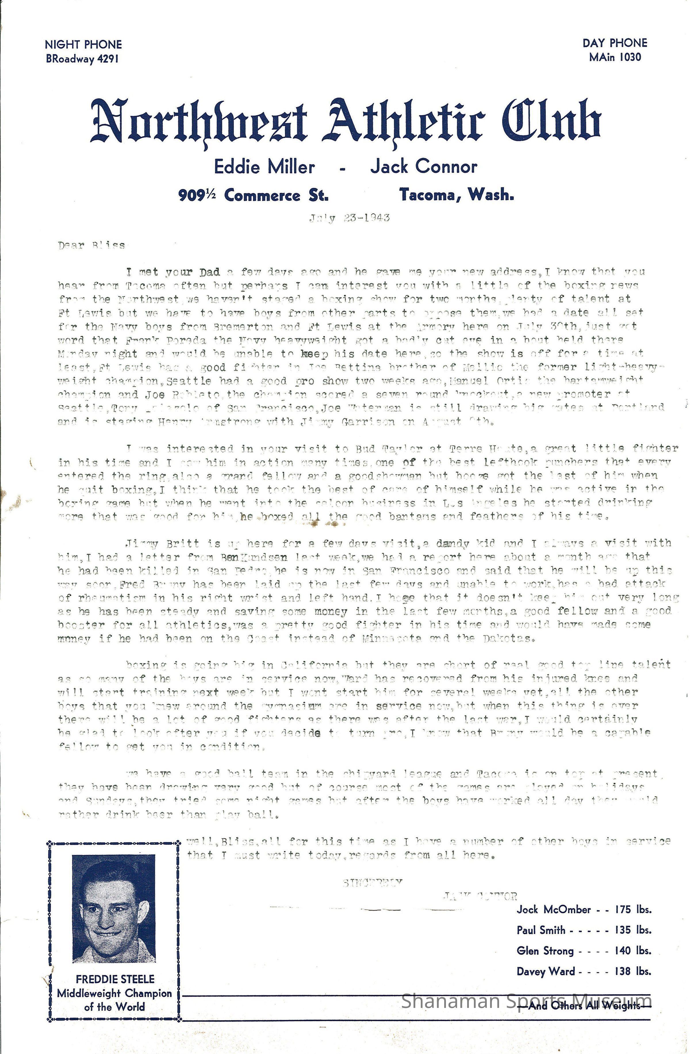 Letter, from Jack Connor of the Northwest Athletic Club to Bliss Lee Croft updating him about boxing in Tacoma while he is away serving in the air force, July 23, 1943. Bliss Croft was a Tacoma native and was an accomplished boxer in the 1940s.Archive Details