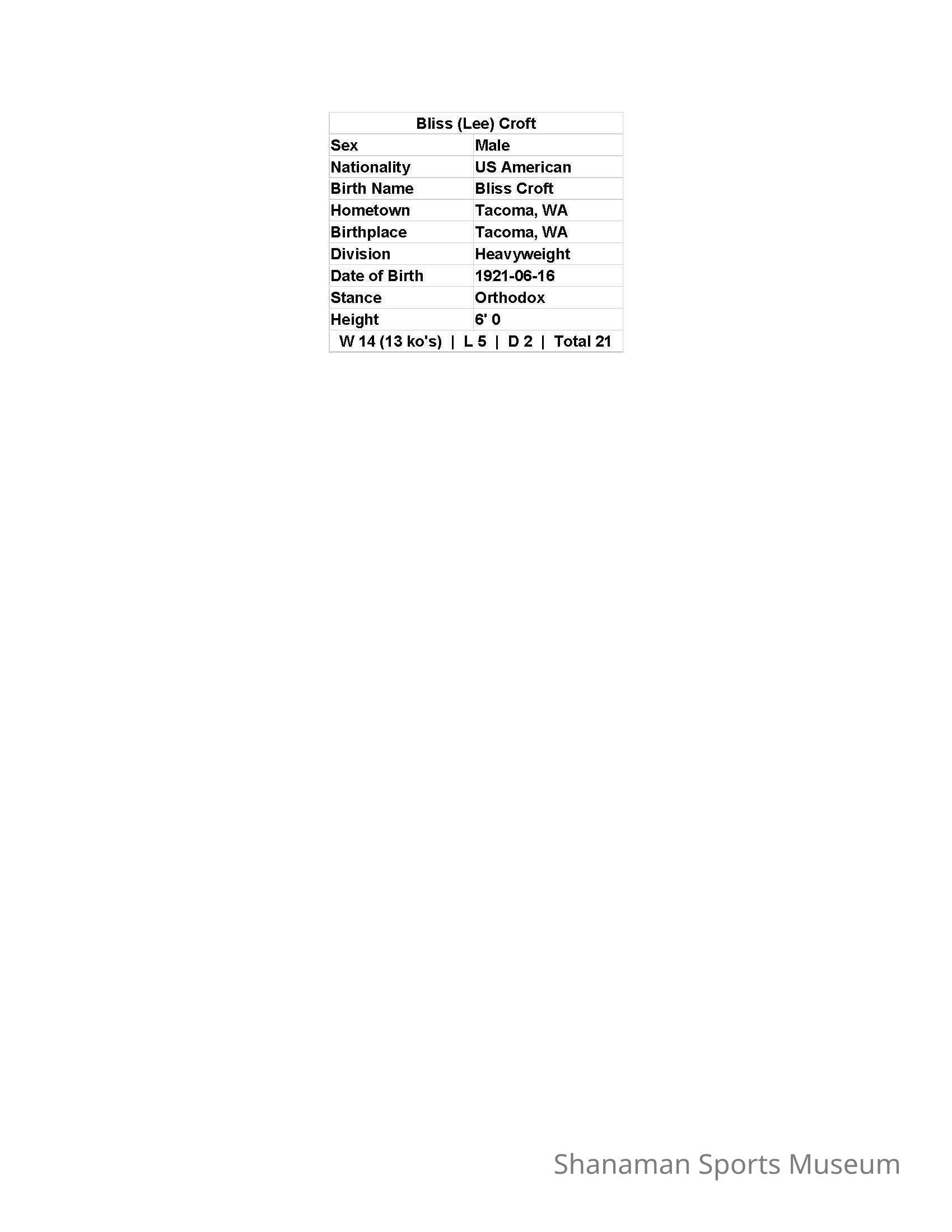 Boxing information for Bliss Lee Croft. Croft was a Tacoma native and was an accomplished boxer in the 1940s.Archive Details