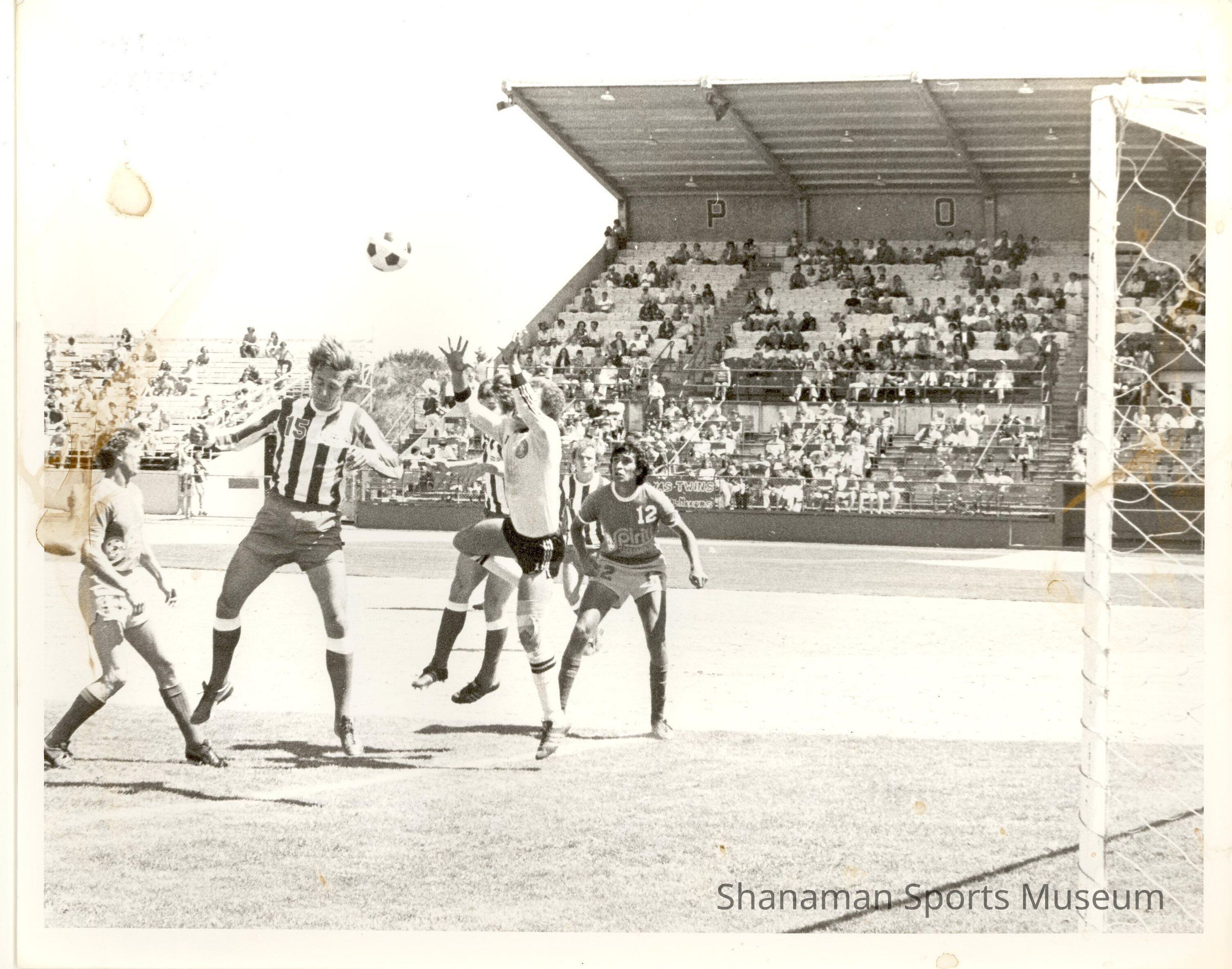 Photo- b/w photo of goalie about to stop a shot during a soccer game.