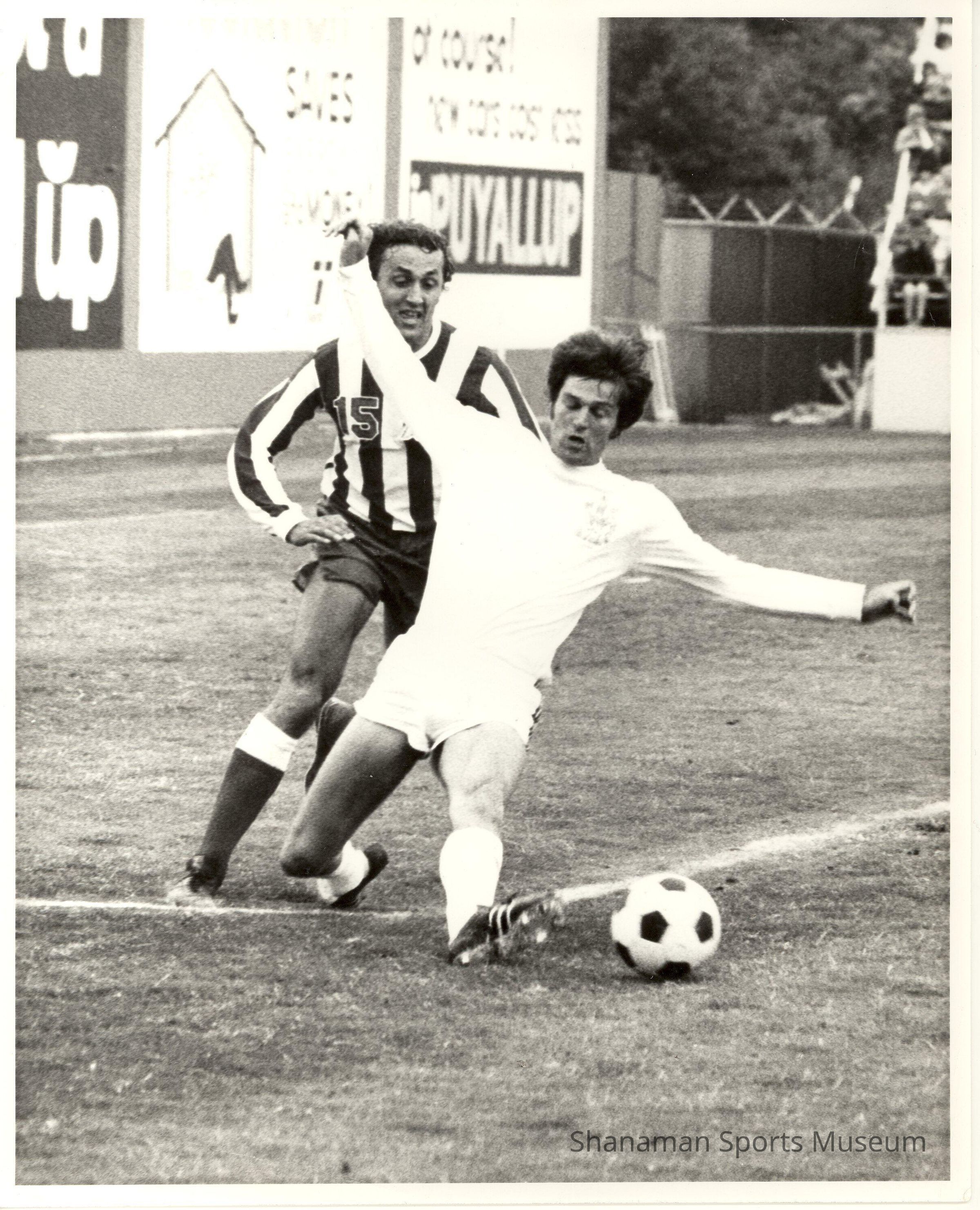 Andy Rymarczuk (15) of the Tacoma Tides takes on an unidentified opponent in an American Soccer League at Cheney Stadium in 1976.