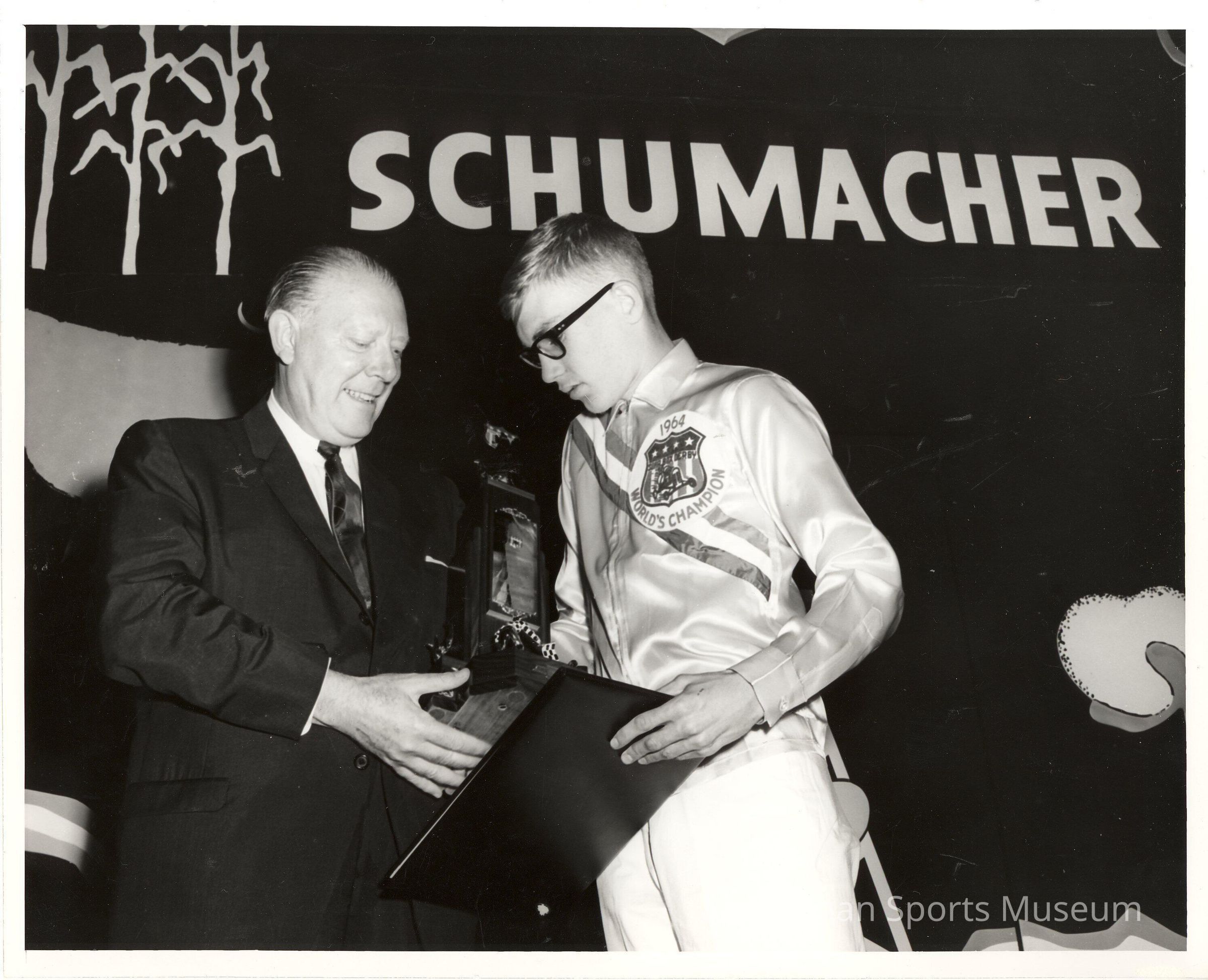 A 14-year-old Gregory Schumacher is presented a trophy by a race official after winning the 1964 All-American Soap Box Derby in Akron, Ohio. Just two years later, another racer from Tacoma won the national championship when David Krussow took first. As part of the 60th anniversary celebration of the All-American Soap Box Derby a hall of fame for the event was established in 1997.Lexicon