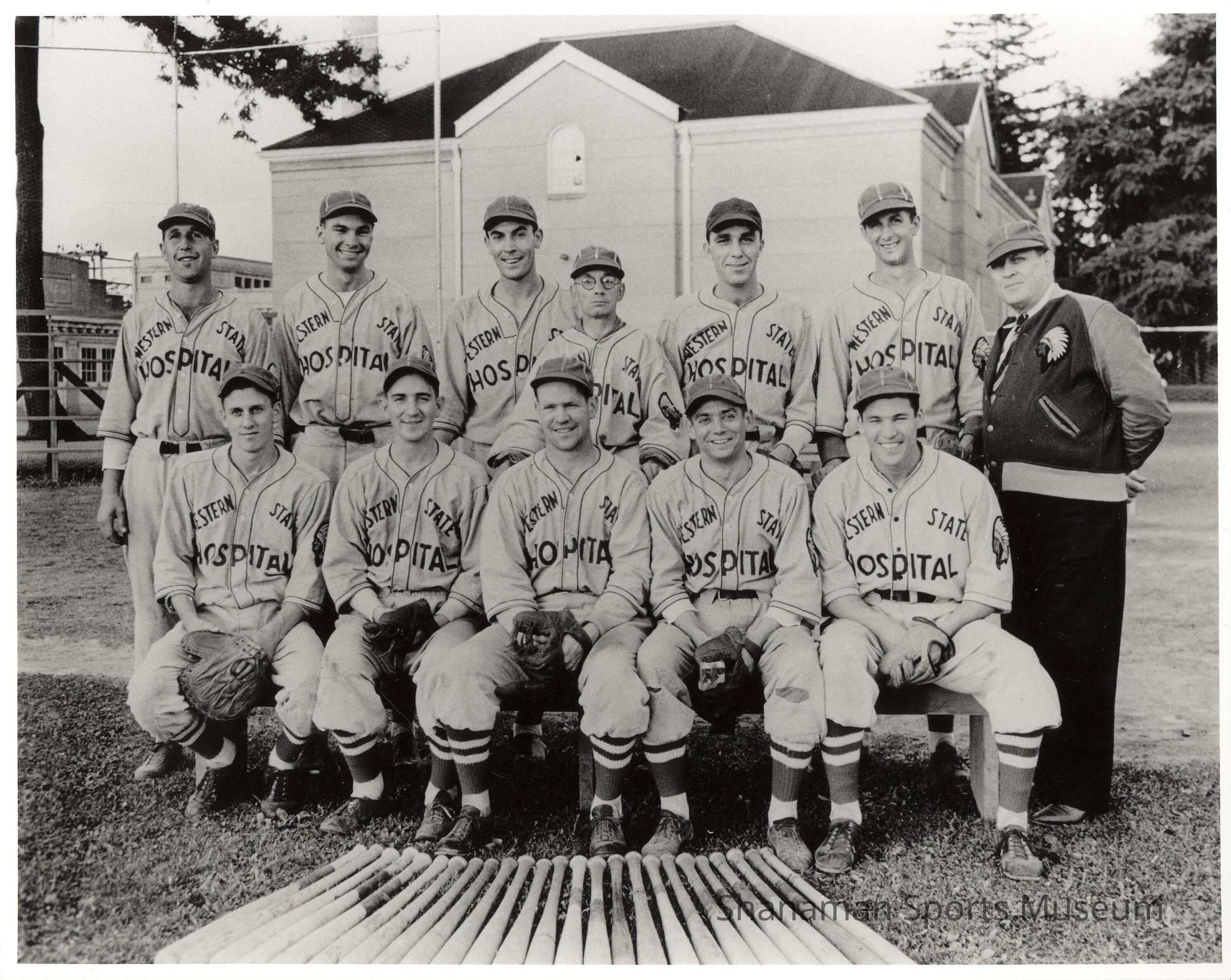 Lornie Merkle, bottom row, second from left, and members of the Western State Hospital baseball team of the Northwest League pose for a team photo.