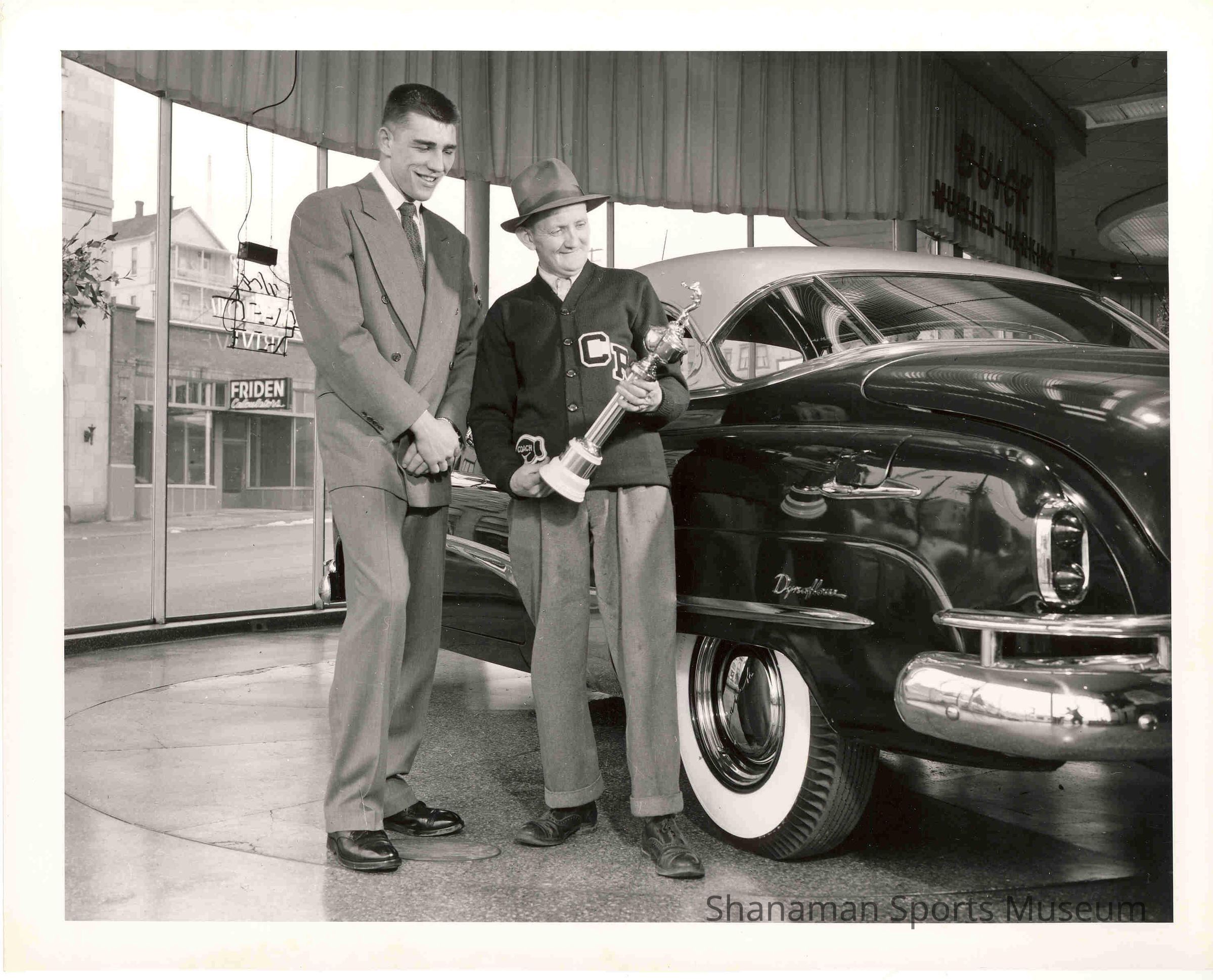 Tacoma boxer Pat McMurtry stands with his trainer, Homer Amundsen, who is holding a trophy McMurtry had won in 1951. McMurtry had won the Northwest Golden Gloves tournament in Seattle and qualified to fight in the national AAU tournament in Boston. The photo was taken with them standing next to a 1951 Buick in the showroom of McMurty's sponsor, Mueller-Harkens. Later in the 1950s, McMurtry turned pro and became a top heavyweight contender as he won his first 16 fights and finished with a 33-4-1 record with 25 knockouts.Lexicon