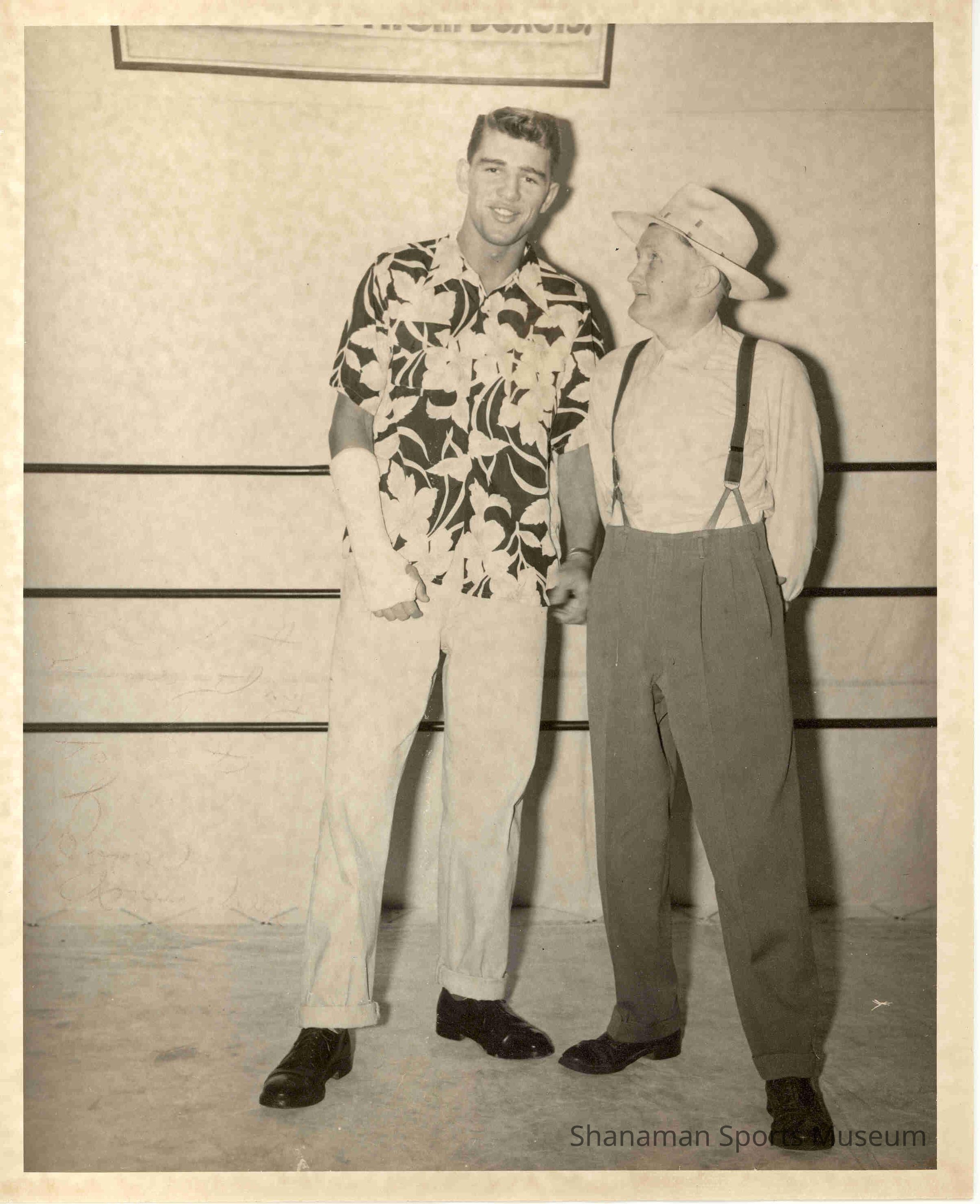 With a cast on his right arm, Pat McMurtry stands with his trainer Homer Amundsen at the 1951 AAU Nationals in Boston. McMurtry broke his right hand on the first night of the tournament but he continued to fight on. He won his next three fights by knockouts. He lost his last fight in the semifinals to the eventual winner, Jack Boutlier, by a decision. McMurtry won the first sportsmanship award of the 63 year history of the tournament for his courageous efforts. McMurtry had an impressive amateur career, winning 103 of 105 fights before turning pro in 1954.Lexicon