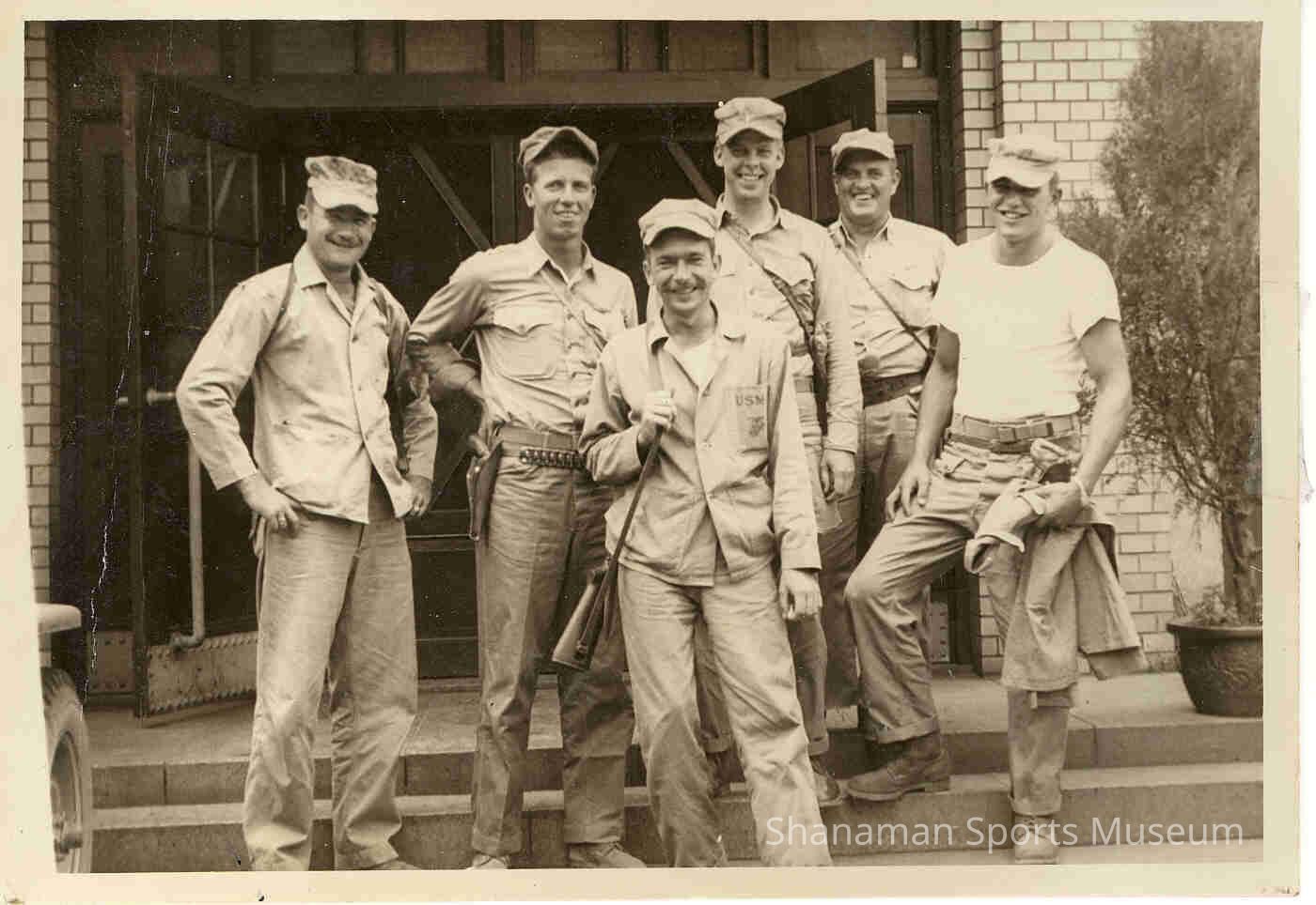 Pat McMurtry (far right) stands with his USMC buddies outside of a restaurant in Seoul, Korea. While in the Marines during the Korean War, McMurtry continued a successful amateur boxing career as he won the All-Marine title in the early 1950s. A broken hand cut short his chances of winning the All-Service championship. Before turning pro in 1954, McMurtry had a sparkling 103-2 record as an amateur. McMurtry won all four of his fights at the inaugural Tacoma Golden Gloves in 1949 to win a championship at 160 pounds. After his successful boxing career as a fighter, he worked 29 years as a referee for boxing.Lexicon