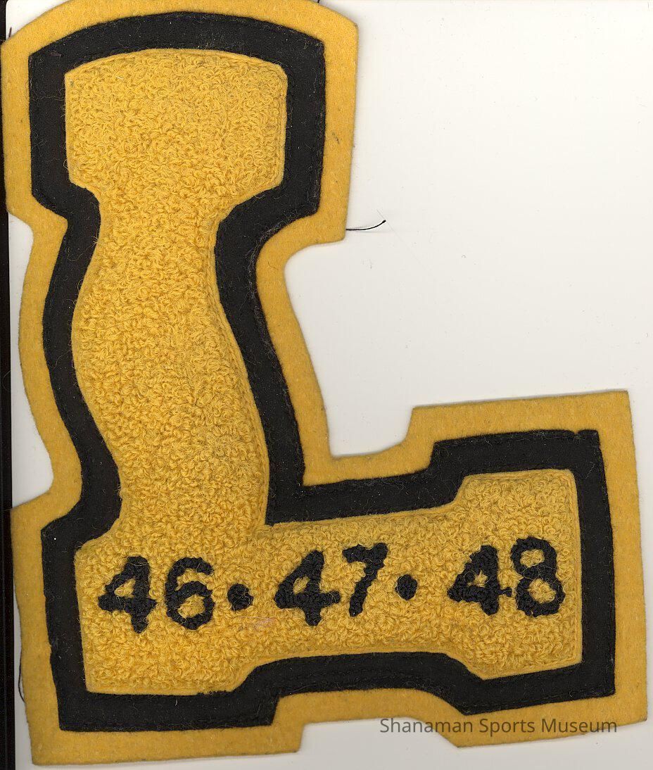 Varsity Letter- "L" for Lincoln High School with 46-47-48 on it. Earned by Marilyn Kropf Appel for tennis in 1948.