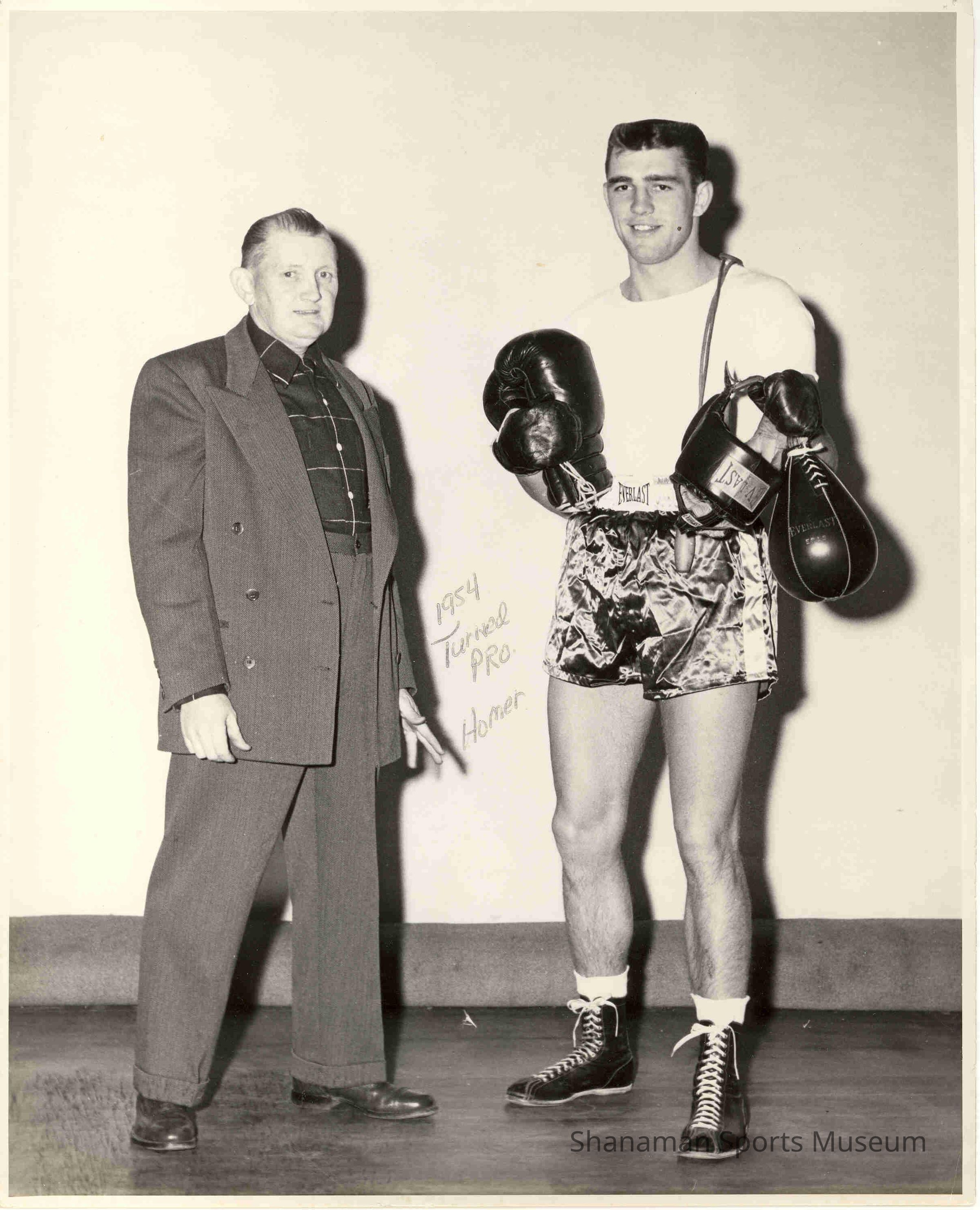 Pat McMurtry (right) stands with Homer Amundsen as McMurtry prepares to turn pro in 1954. McMurtry was born to be a boxer. His father, Clarence, who was an amateur boxer, said to his wife when they were married that they were going to have two sons and both were going to box. On Christmas in 1939, Clarence gave his two sons boxing gloves and he'd take them to the finals of the Golden Gloves in Seattle every year. Eventually, the two brothers would win that same tournament and they grew up to be very successful boxers. The two brothers are consider to be among the best boxers to come out of Tacoma. They've both been inducted into the Tacoma-Pierce County Hall of Fame. In addition to his father's impact, Pat credited Homer for his contributions to their success boxing. “A lot of credit for our success can be traced right back to Homer,” he said.Lexicon