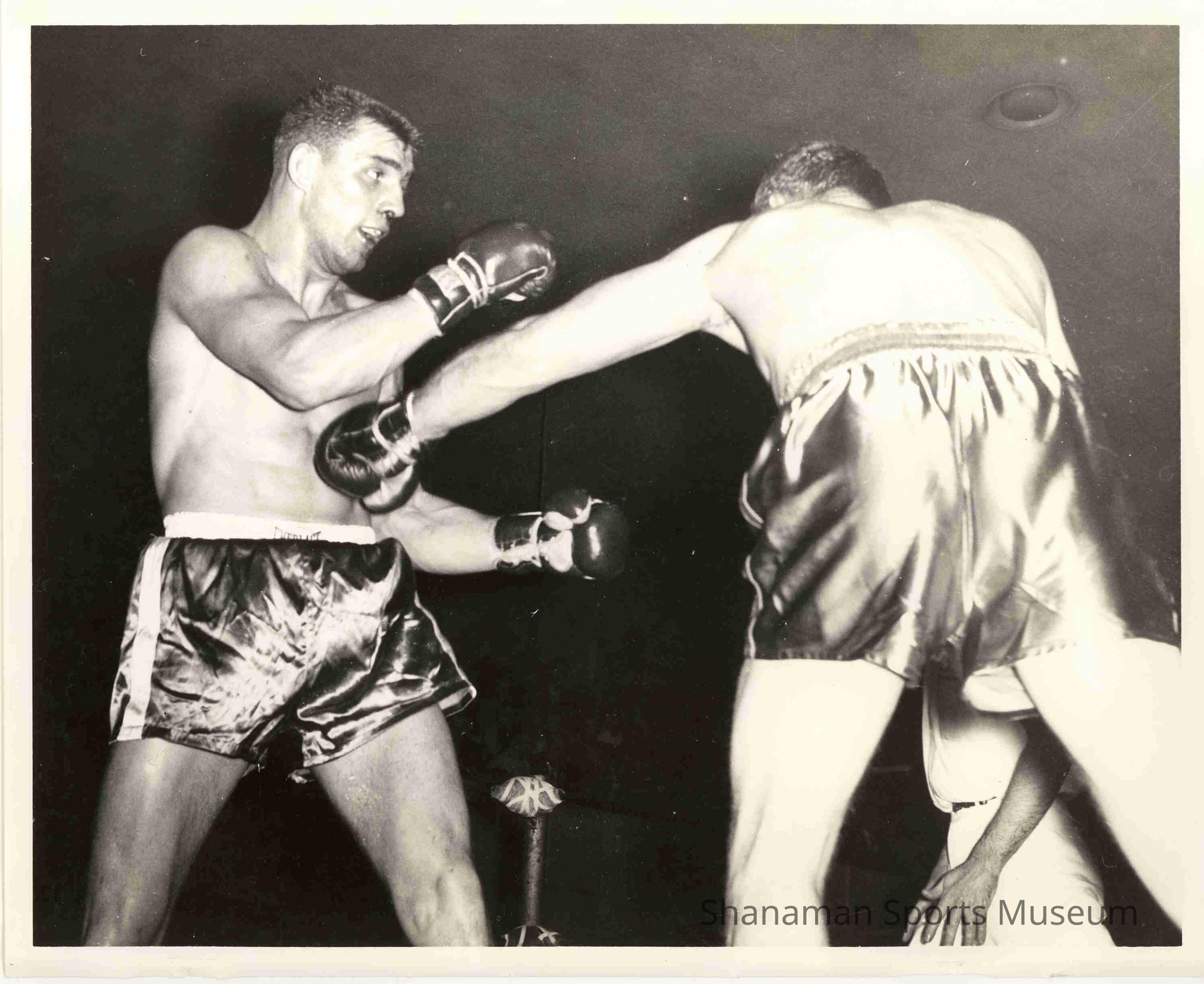 Pat McMurtry takes a left jab to the stomach and prepares to counter with a combination of a left hook and right cross against an unidentified opponent. Tacoma's Davy Ward was the referee in this fight back in 1954. After a successful amateur career when McMurtry won 103 of his 105 fights, he turned pro in 1954. And when he turned pro, his father, Clarence, became his manager. It was a fitting decision. Clarence was the reason Pat got into boxing. When Clarence got married, he told his wife they were going to have two sons and they were both going to box. Both wishes came true.Lexicon