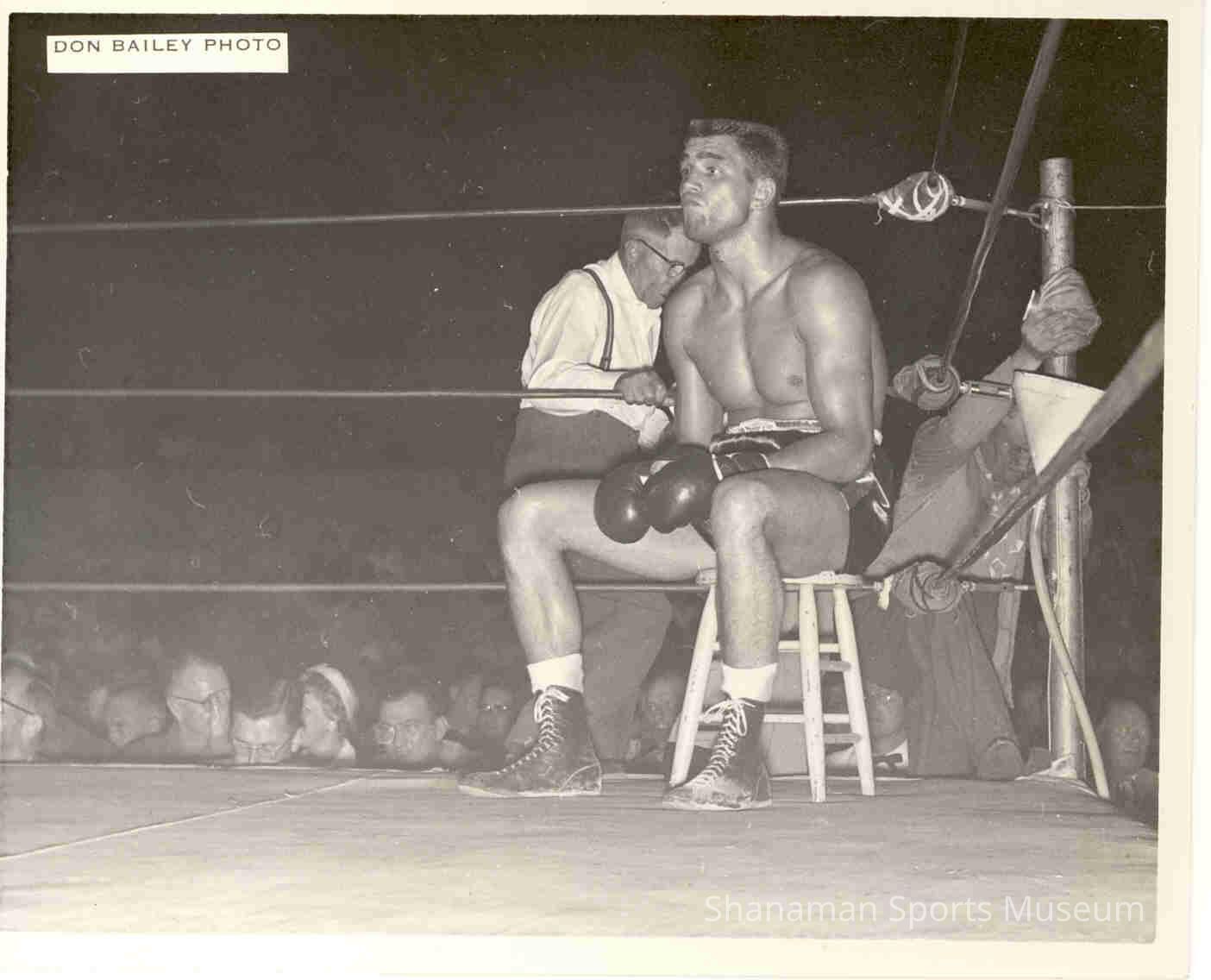 Pat McMurtry rests in between rounds during a professal heavyweight fight in 1954. McMurtry's corner man, Franke “Chi Chi” Britt, stands in McMurtry's corner waiting for the bell to ring to start the next round. Britt was a well-known featherweight and later lightweight during the 1920s and would contend for the Pacific Coast title. On Dec. 21, 1921, he fought Mike Ballerino to a draw in what was Ballerino's first pro fight. Ballerino went on to be an world junior light weight title in 1925. McMurtry turned pro in 1954 after a long successful amateur career when he went 103-2.Lexicon