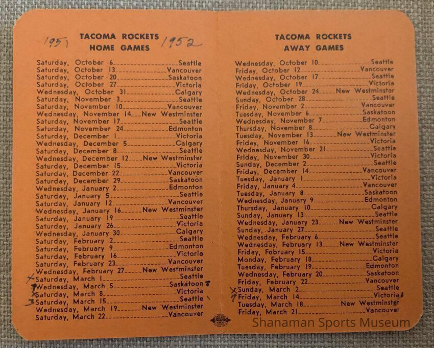 Schedue Tacoma Rockets Season 1951-1952 Found during move January 2019
