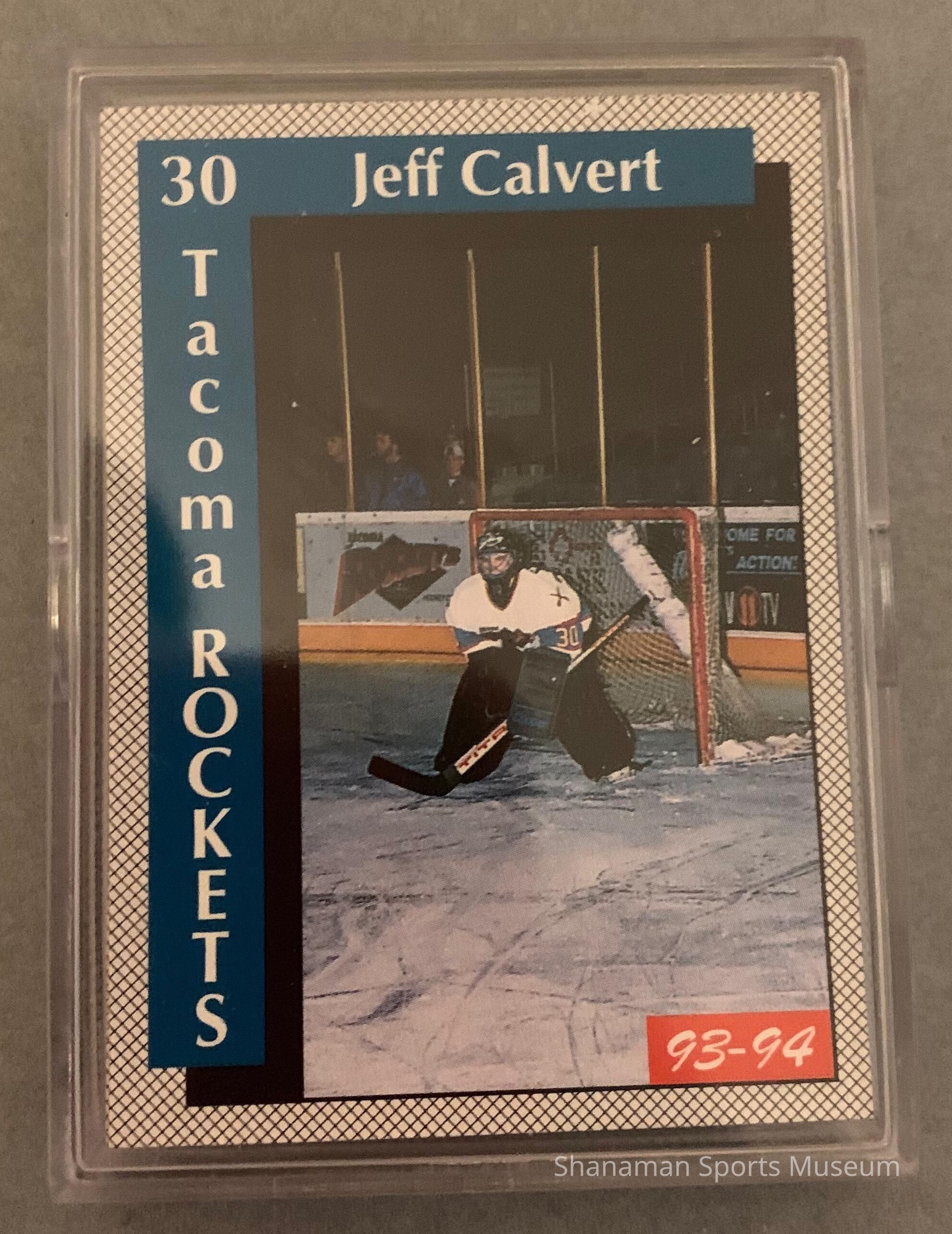 Set of trading cards for the 1993-94 season of the Tacoma Rockets. #30 Jeff Calvert featured on first card. Found during move January 2019