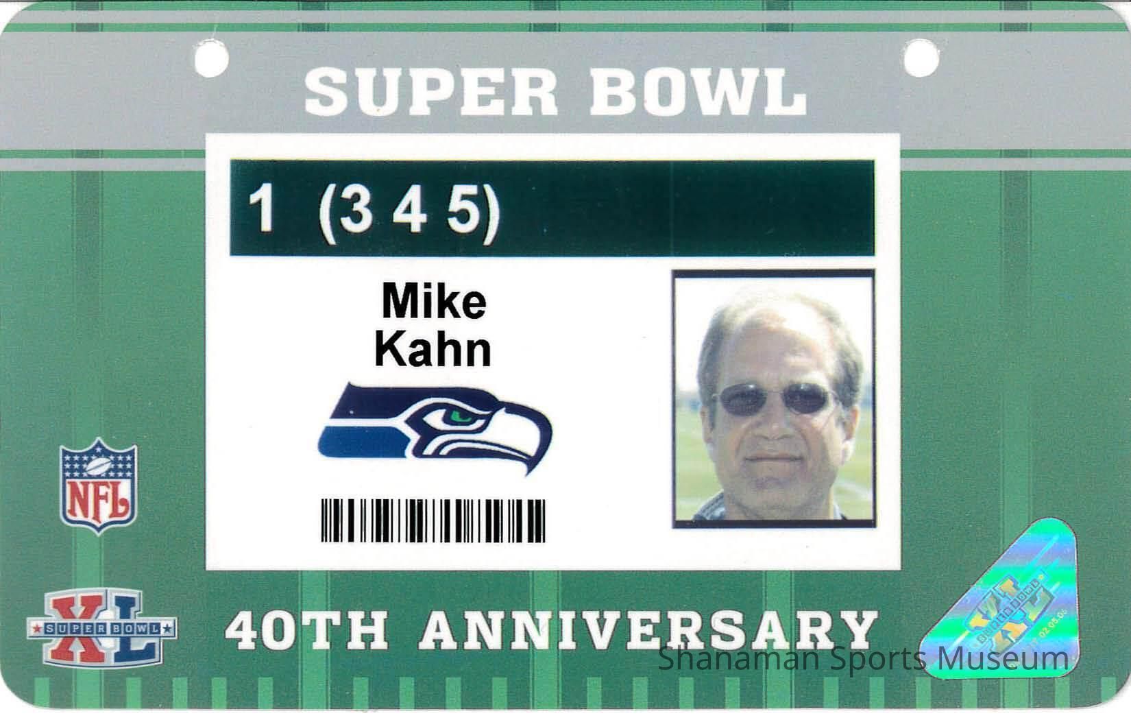 Press Pass Cards, Super Bowl, 40th Anniversary, for Mike Kahn.