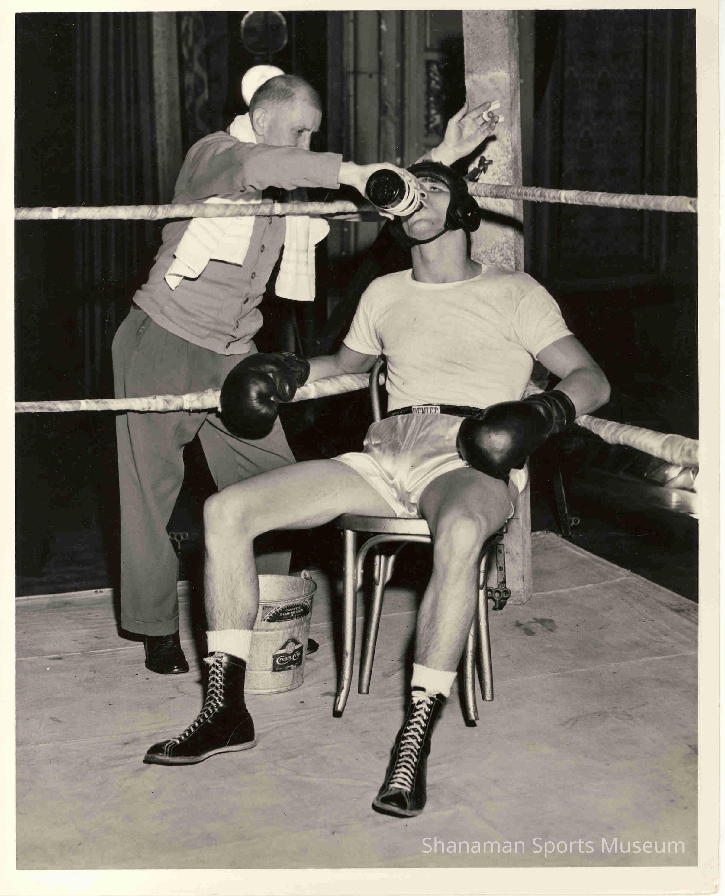 Pat McMurtry takes a drink from his trainer Homer Amundsen during a fight at the Roxy Theater in 1954. McMurtry was in his first year as a pro fighter and he would become the fifth ranked heavyweight in the world and a top contender by the late 1950s. He'd become the Northwest's most popular sports star. McMurtry called Amundesen the best teacher he had ever known and credited him for his success in the boxing ring. McMurtry's fight in this photo was prior to a movie at Roxy Theater that starred Robert Ryan, Kirk Douglas and Jan Sterling.Made/Created