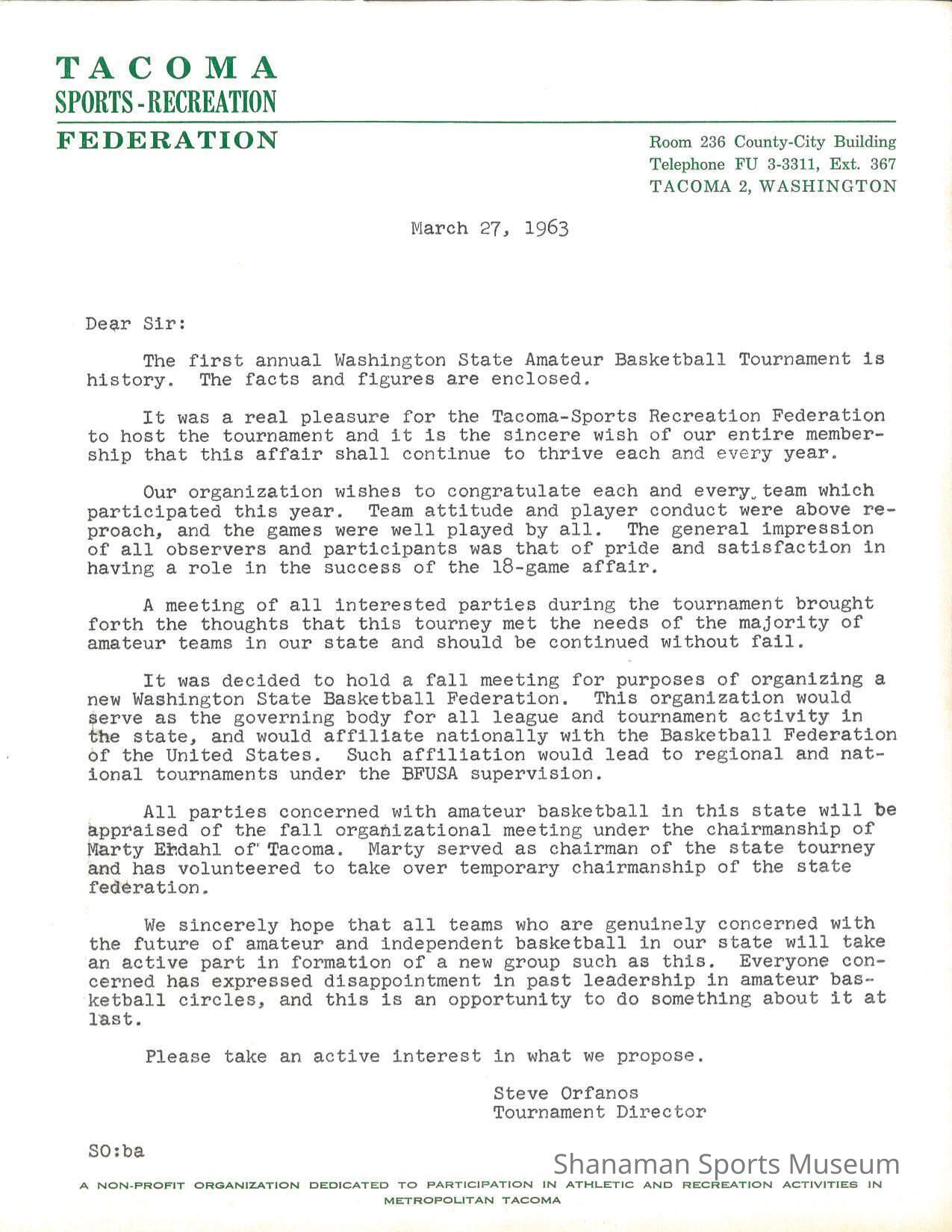 letter, from Steve Orfanos, Tacoma Sports Recreation Federation, regarding the first annual Washington State Amateur Basketball Tournament, March 27, 1963.Lexicon