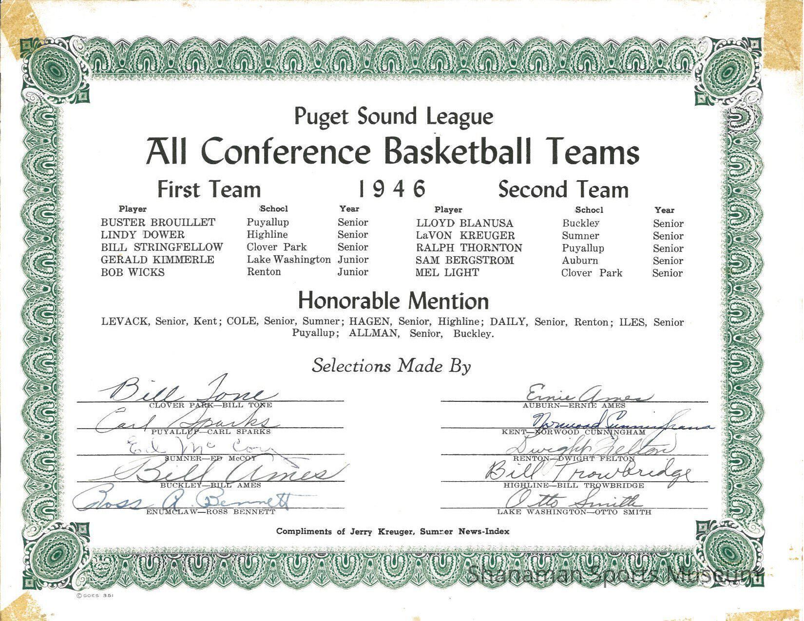 certificate, Puget Sound League All Conference Basketball Teams, 1946.Lexicon